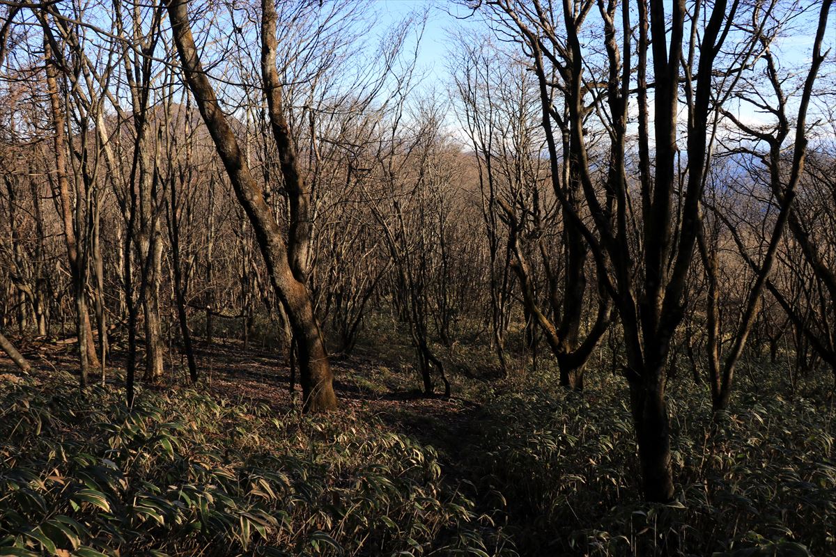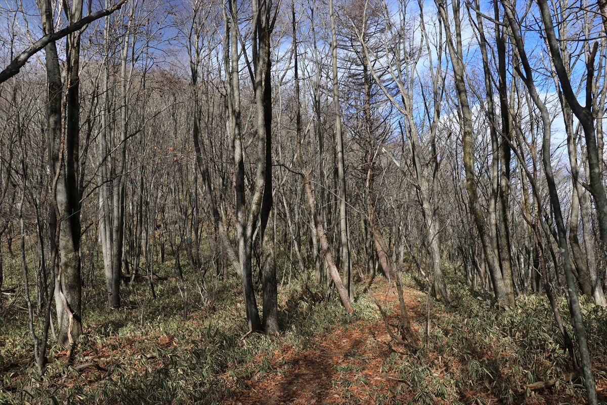 坂を下りきった後は暫く緩やかな広尾根となります。陽の光が樹間から降り注ぎ、明るい雰囲気。