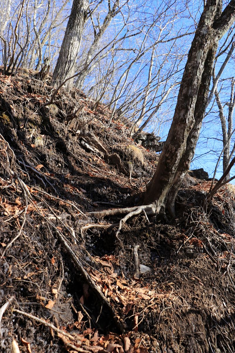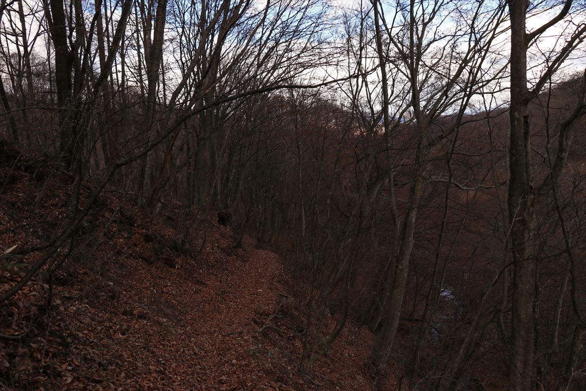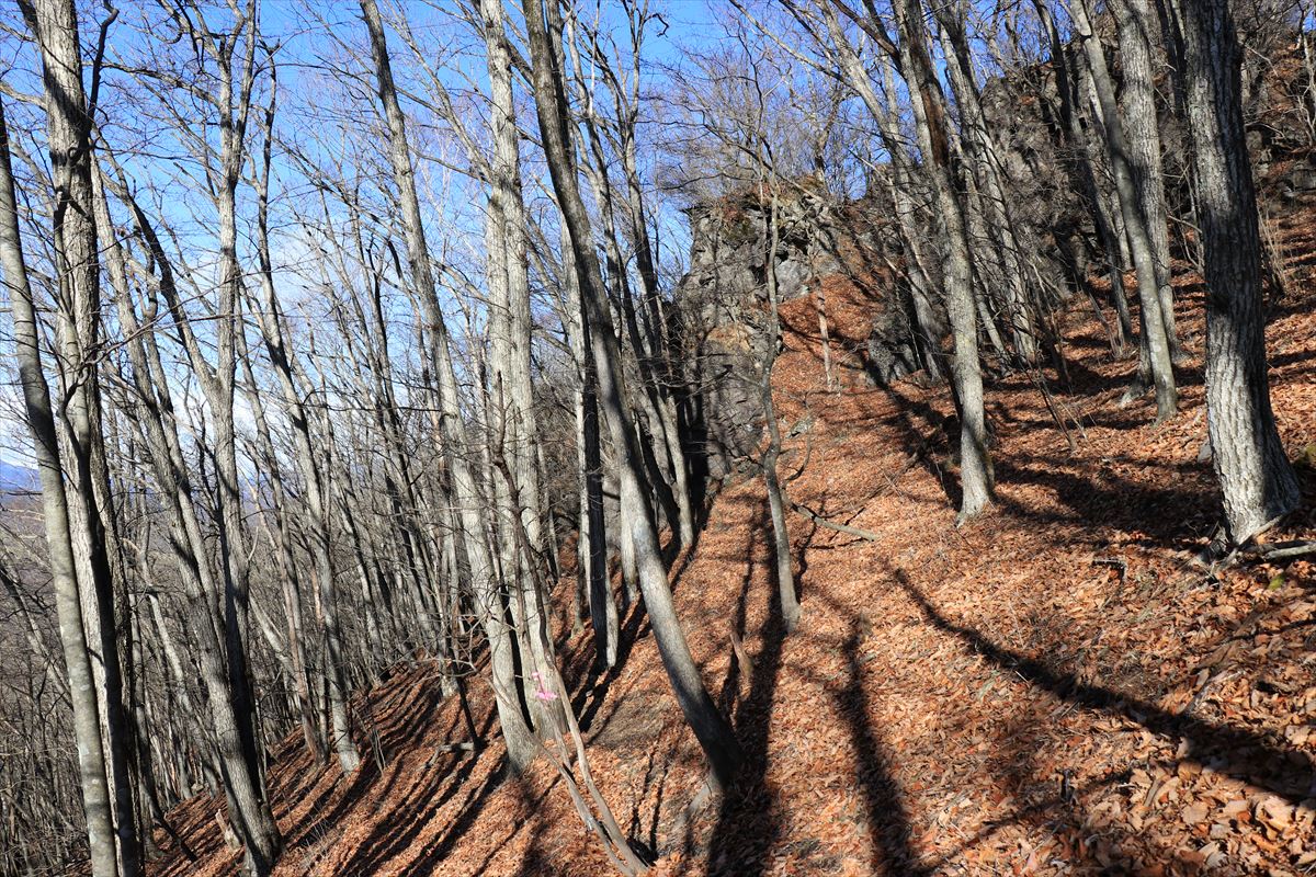 岩場を下り終えたら所から先の急坂のトラバース。季節柄、落ち葉が堆積していて滑りやすく慎重に通過した。