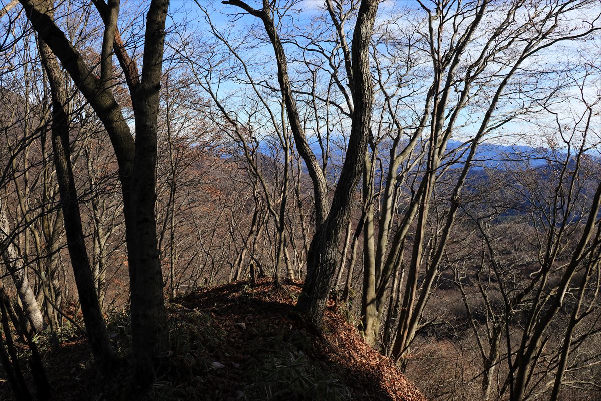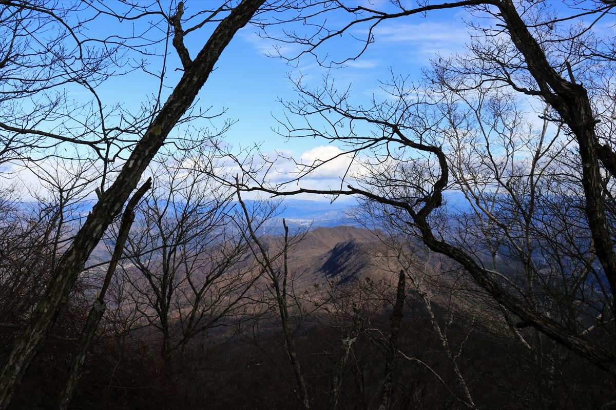 北東方面の樹間からは中之条の市街地、その左手前という所には翌日帰り道で立ち寄った岩櫃山が見えています。