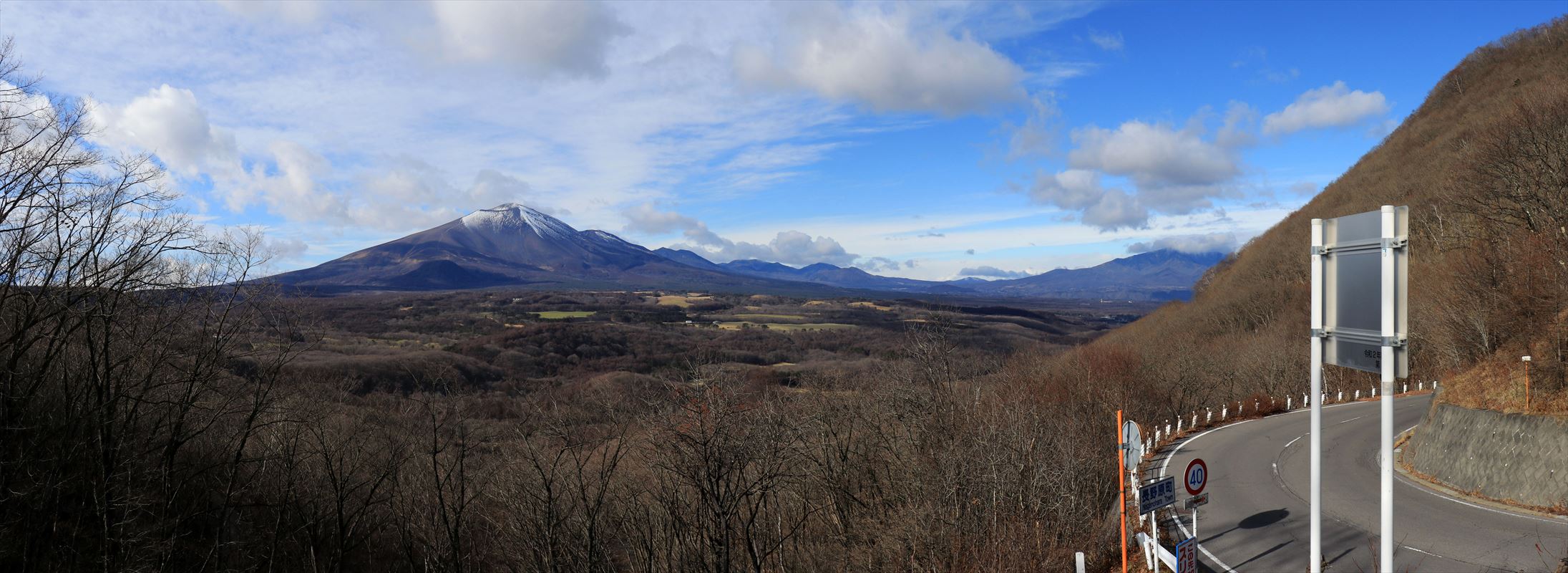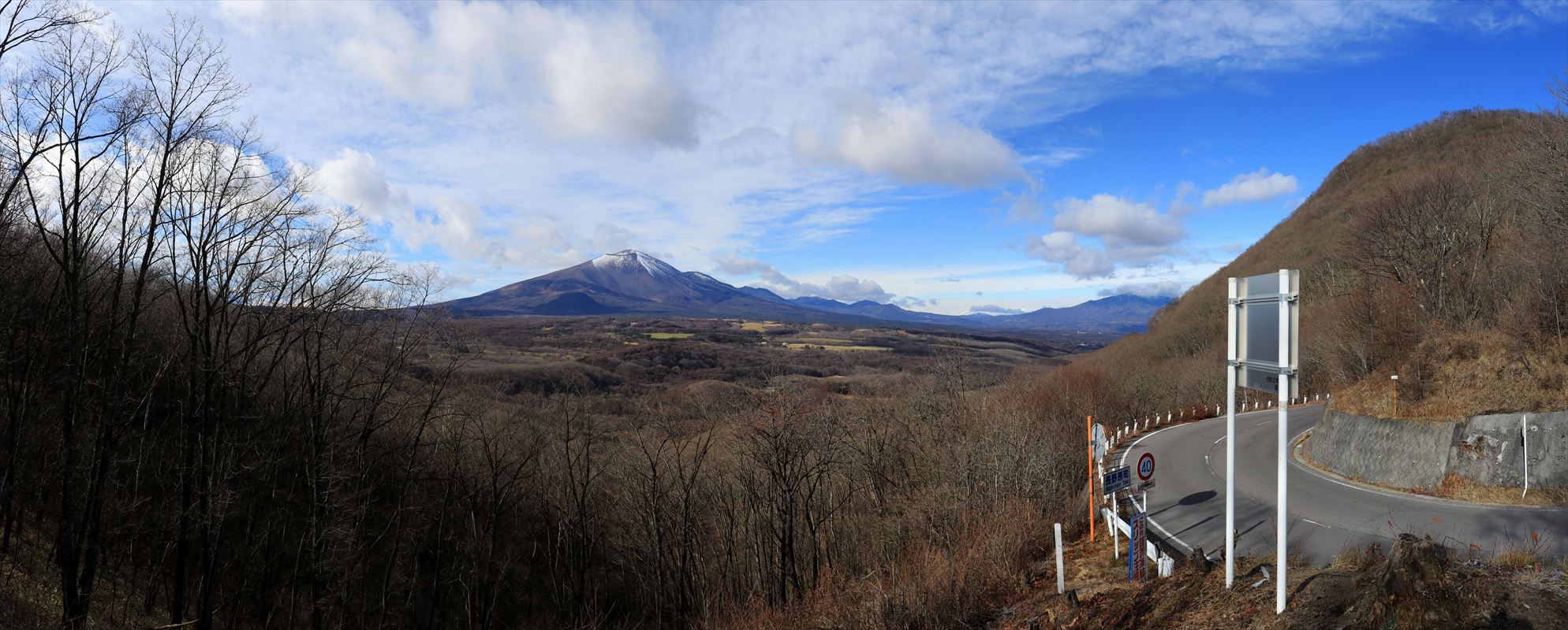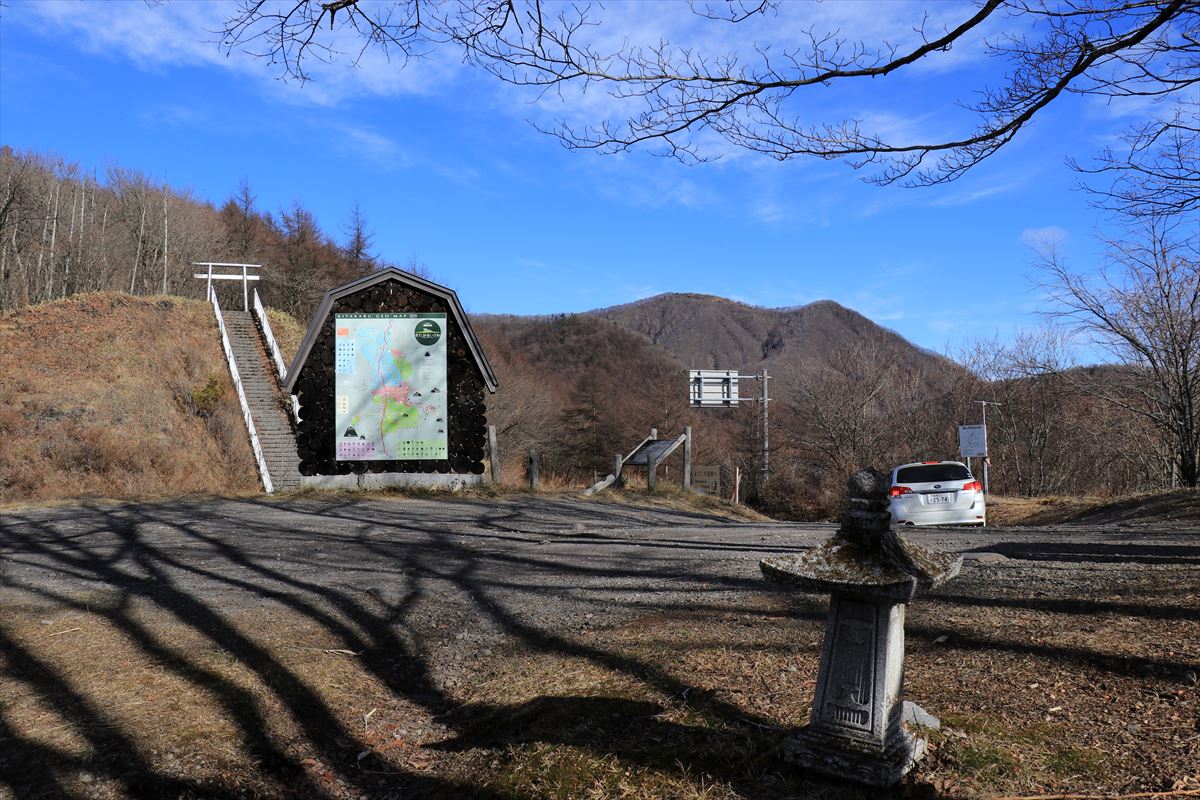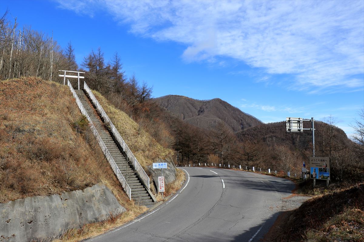 二度上峠に到着しました。高崎と嬬恋村方面を結ぶ道路上のサミットで、付近は展望台として整備されていました。巨大な案内パネルと、駒髪山へと続く石段と鳥居が印象的。