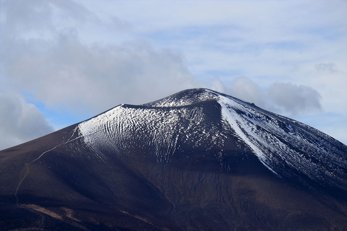 浅間山の山頂の望遠。碓氷峠から10km近く北上した事で見え方が変わり、やや雪が多く見られるようになりました。