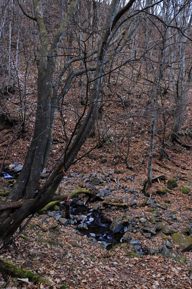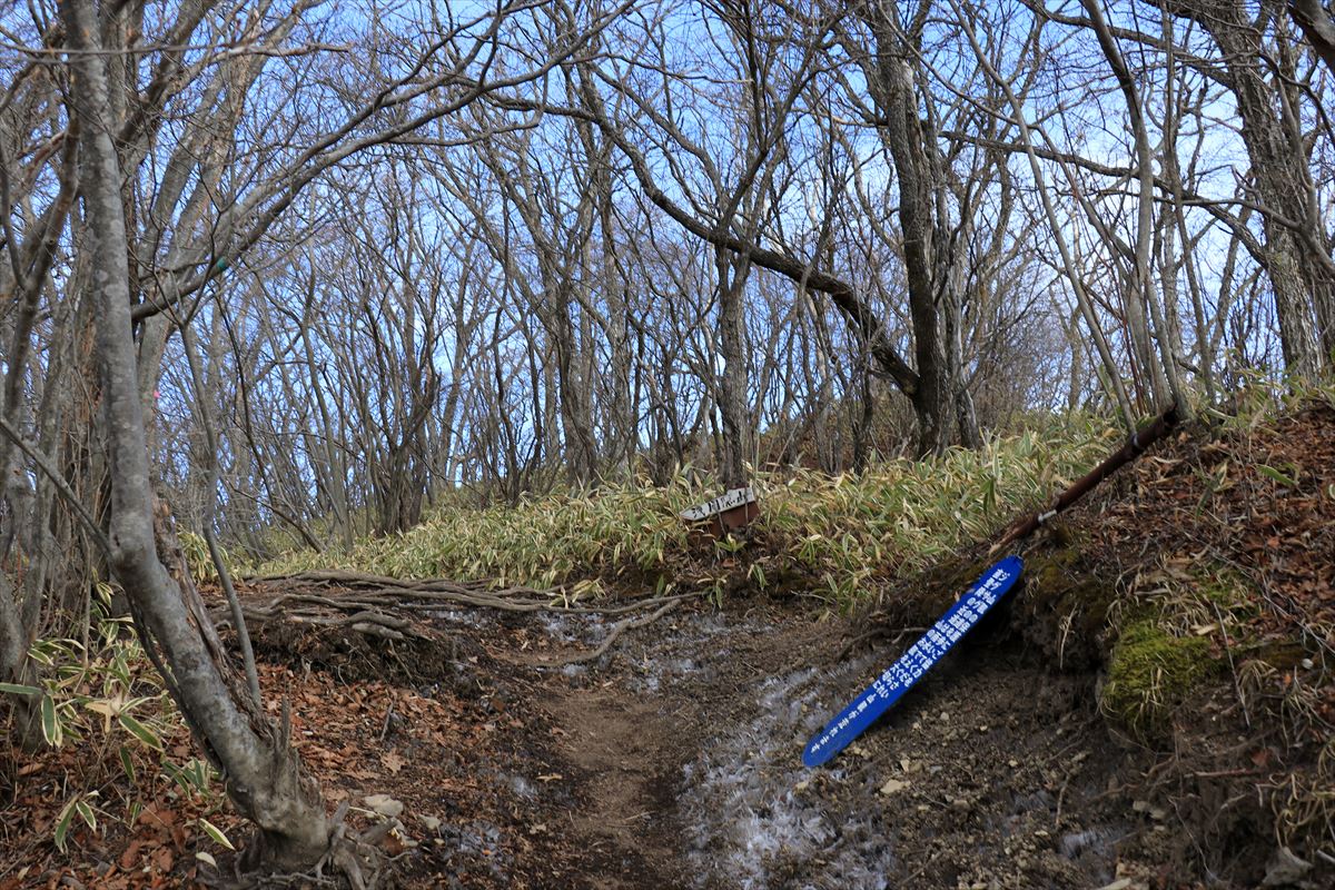 沢沿いの道と道標。この付近で犬を連れて猟をしている方に遭遇。登山口に車が無かったので、まさか人が入っているとは思わなかったと驚かれてしまった……間違えて撃たれなくてよかった。