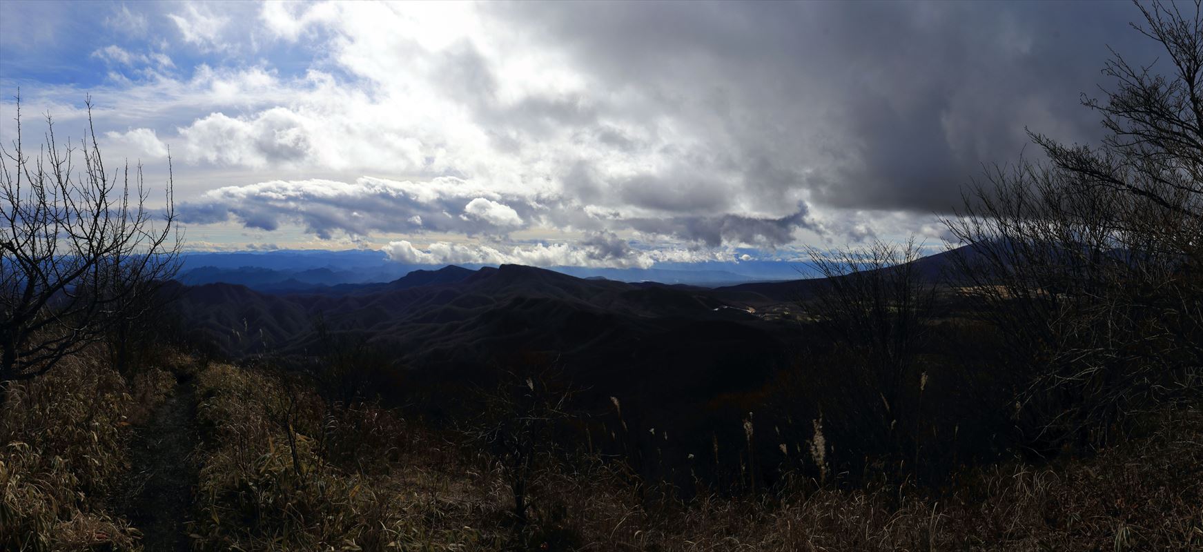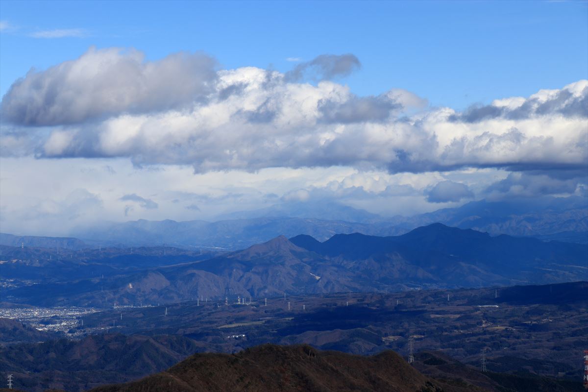 浅間隠山の右側に見えた稜線。日光白根山や尾瀬周辺の山々が見える方面ですが、粗方雲に隠れてしまっている。一方、手前の榛名山や赤城山といった山は前日同様よく見えています。