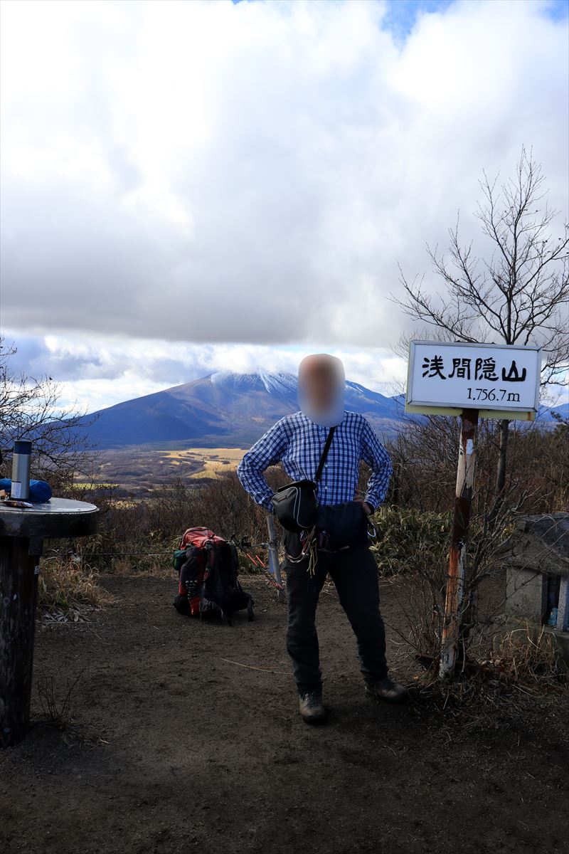 今回の登山におけるメインである浅間隠山に到着。浅間山を間近に臨める絶好のロケーションですが、登っている間に雲が上がってきてしまい山頂部が見えなくなってしまいました……浅間隠山という山の名前を体現しているようで腑に落ちる所もあったり。