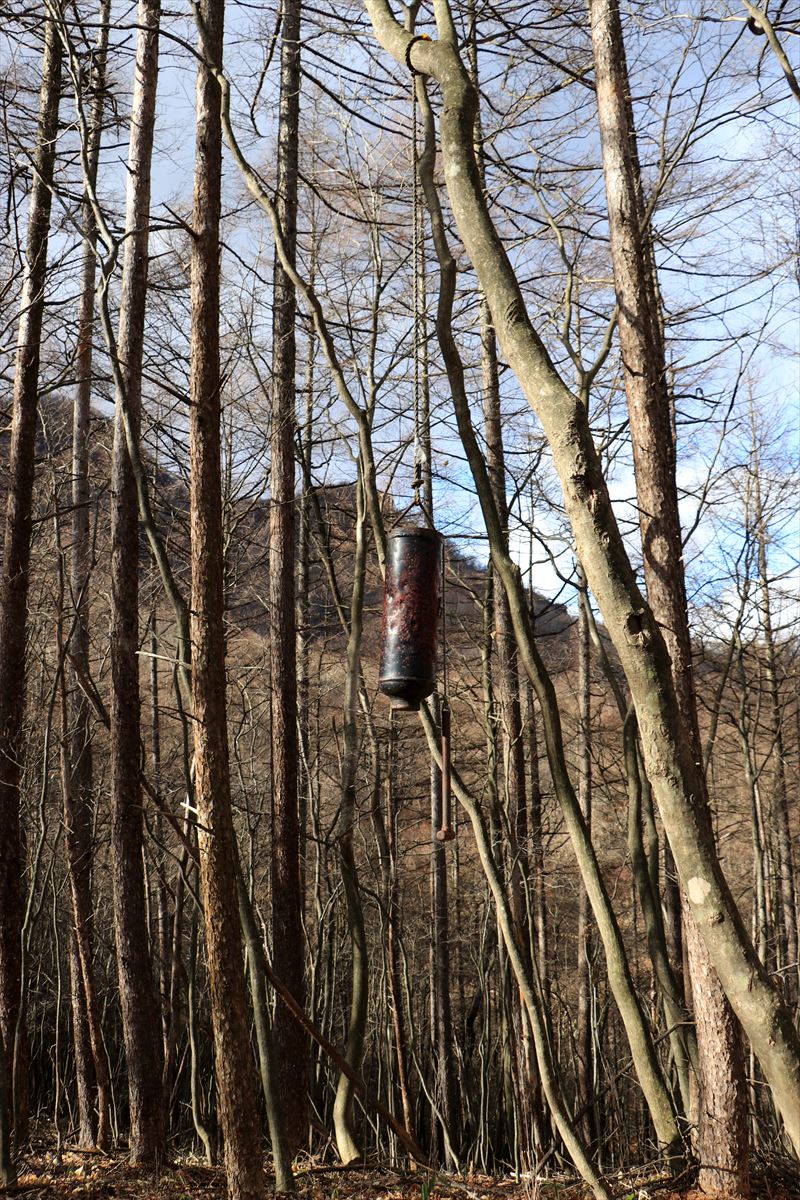 既に随分と高い所にある浅間隠山を見上げる。付近には熊避けの缶(ハンマーで叩いて鳴らす)が吊るされていましたが、流石にこの時期は冬眠中でしょう。