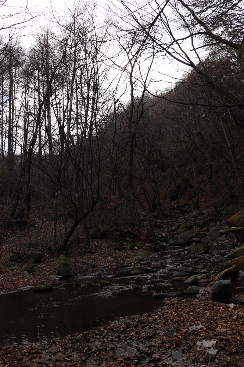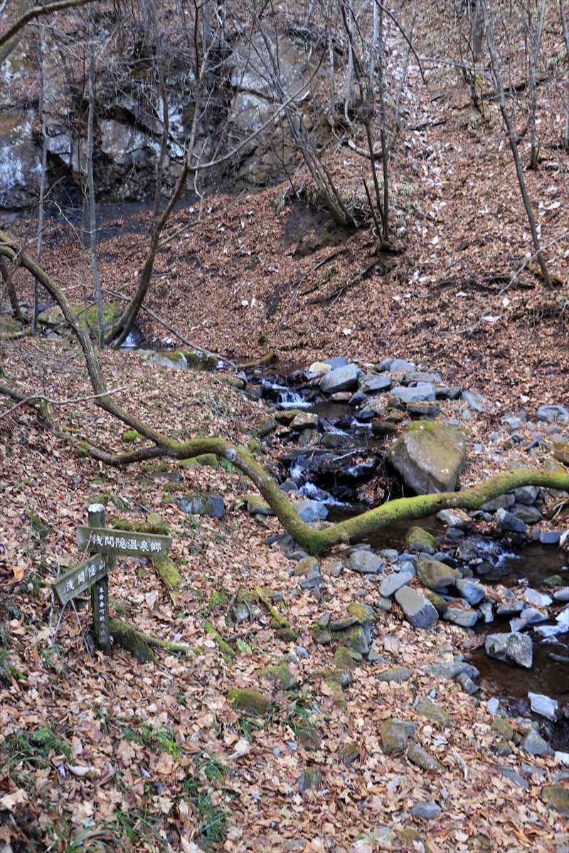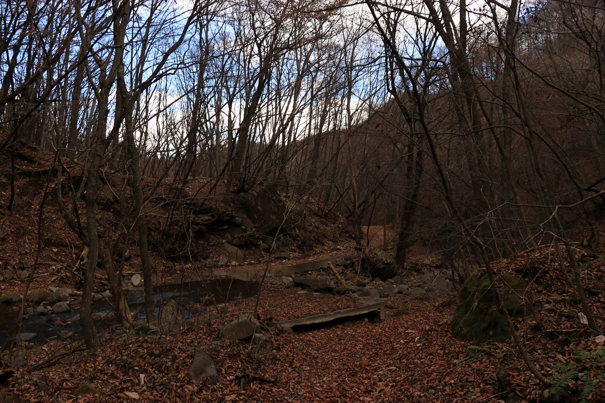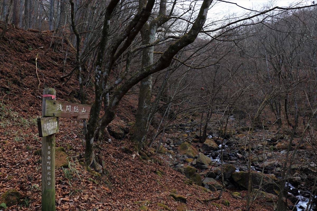 更に先に進むと下の方に沢が見えてきました。浅間隠温泉郷や吾妻川に向かって流れる温川の上流で、以降はその沢に沿って下っていくようです。