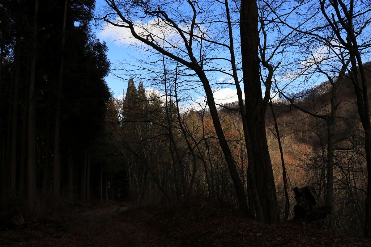 林道をひたすら進んでいく。樹間に見える青空が妙に鮮やか。