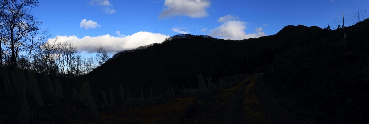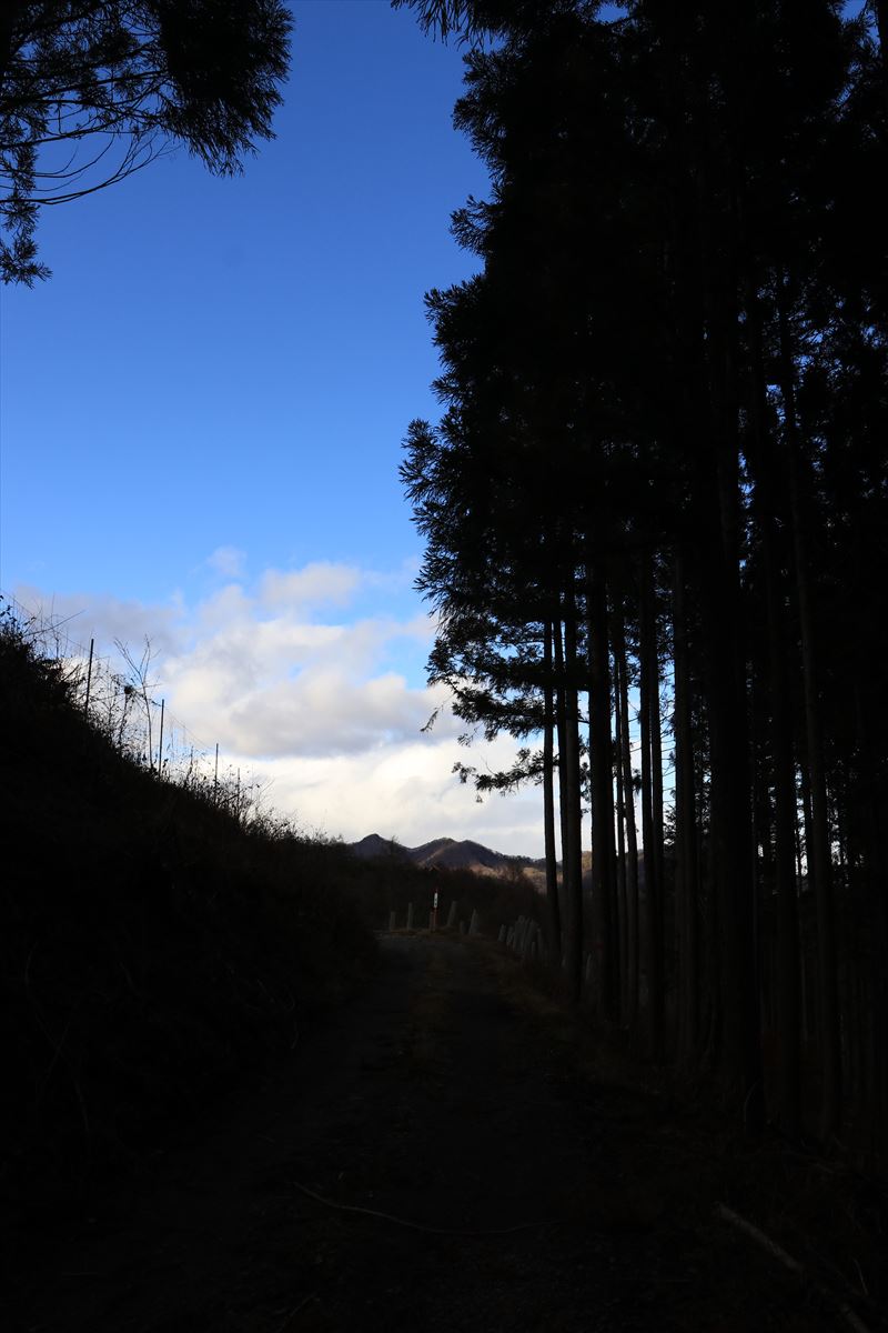 黙々と林道歩きを続けるのもしんどいので、時々振り返って適度に展望を楽しみながら進んでいく……が、途中で日没となり次第に薄暗くなってきた。
