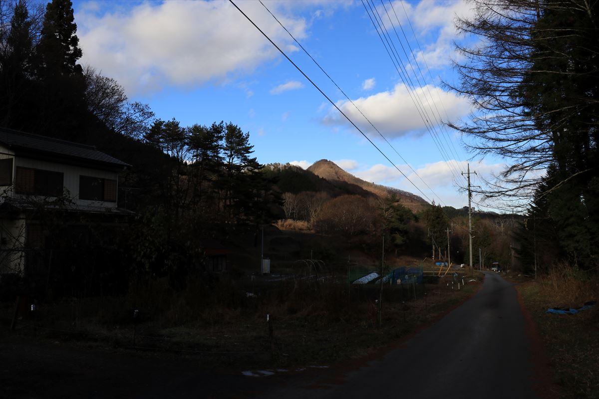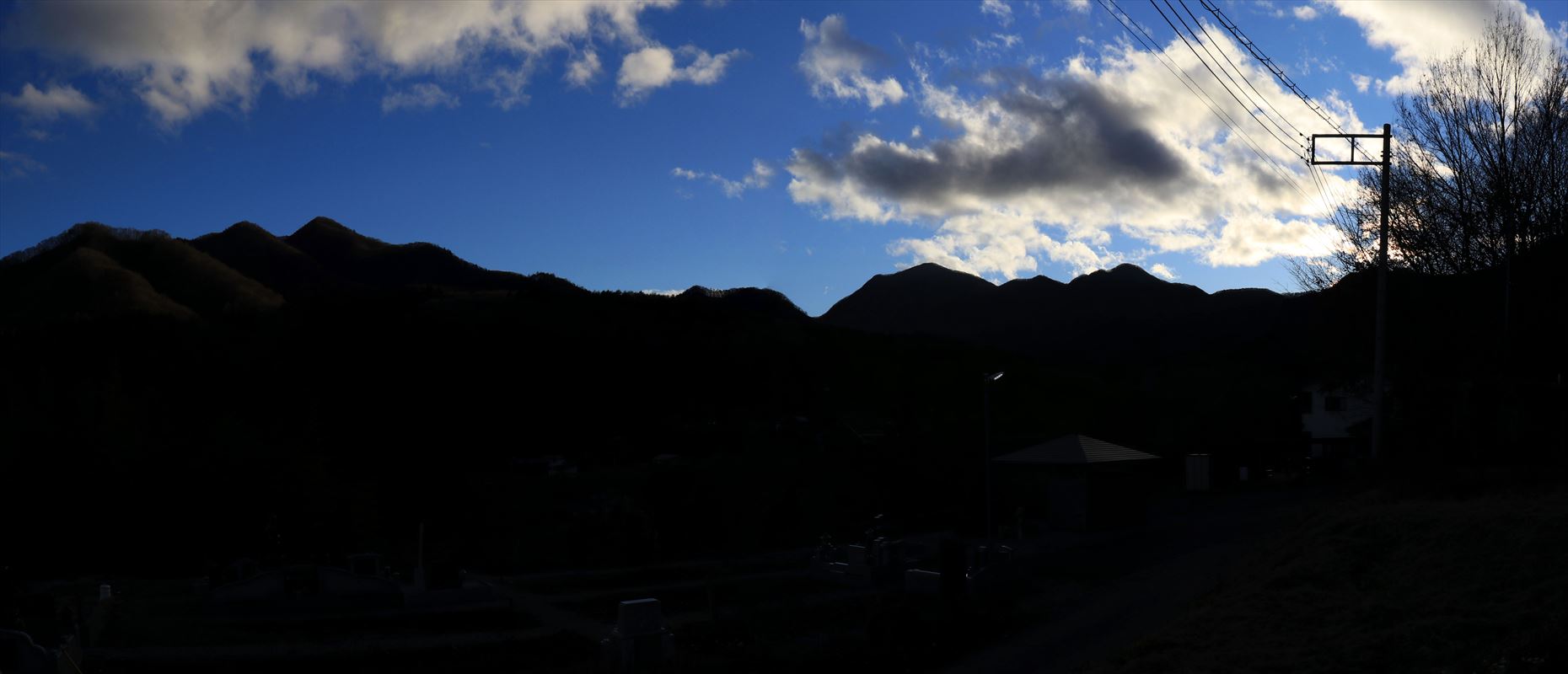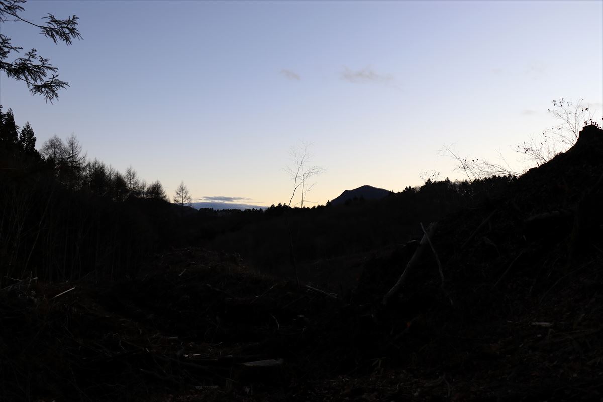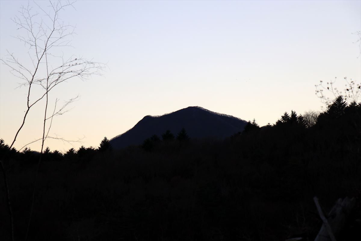 辺りがすっかり暗くなり始めた中、振り返るとお昼に登った浅間隠山が見えました。