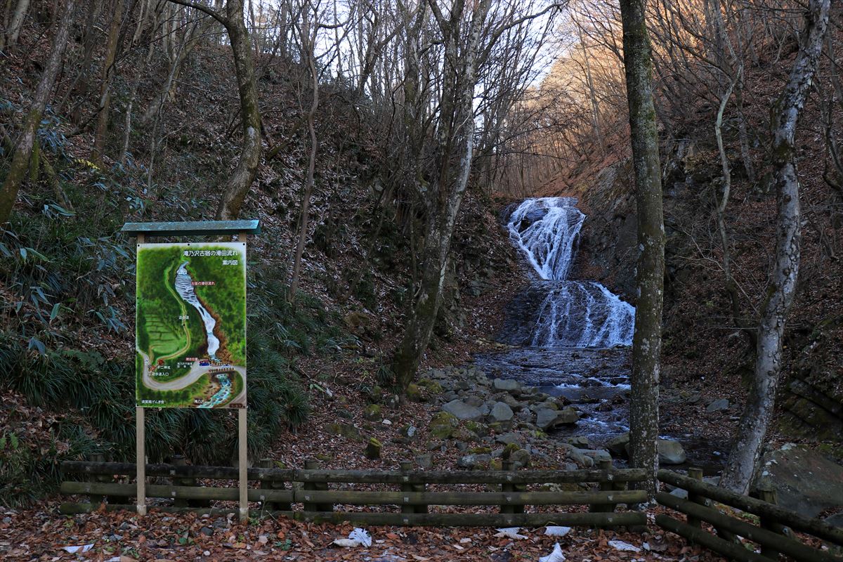 展望台越しに不動ノ滝。更に上流に進んだ所には滝乃沢古宿の滑田流れというナメ沢のような景勝地があるらしく、散策路が続いているらしいです。