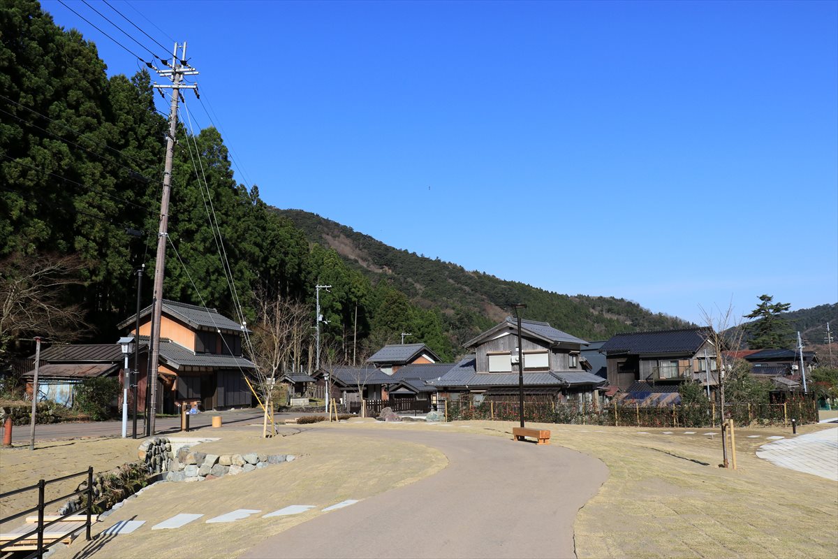 道の駅若狭熊川宿の全景。近江と若狭を結ぶ道という重要性は若狭街道と呼ばれていた時代から変わらず大きいようで、並行する国道303号線は大型車が絶え間なく行き交う。