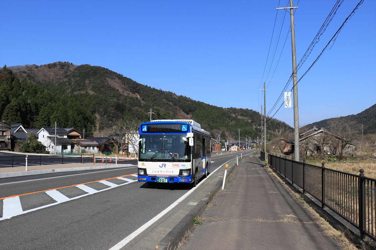 予定のバスに乗車。上中駅から乗車した際は自分一人しか乗車していませんでしたが、一本遅いこちらの便は意外にも混雑。特に遠方への利用が多い路線のようで、スーツケースを携えた方の姿が目立っていました。