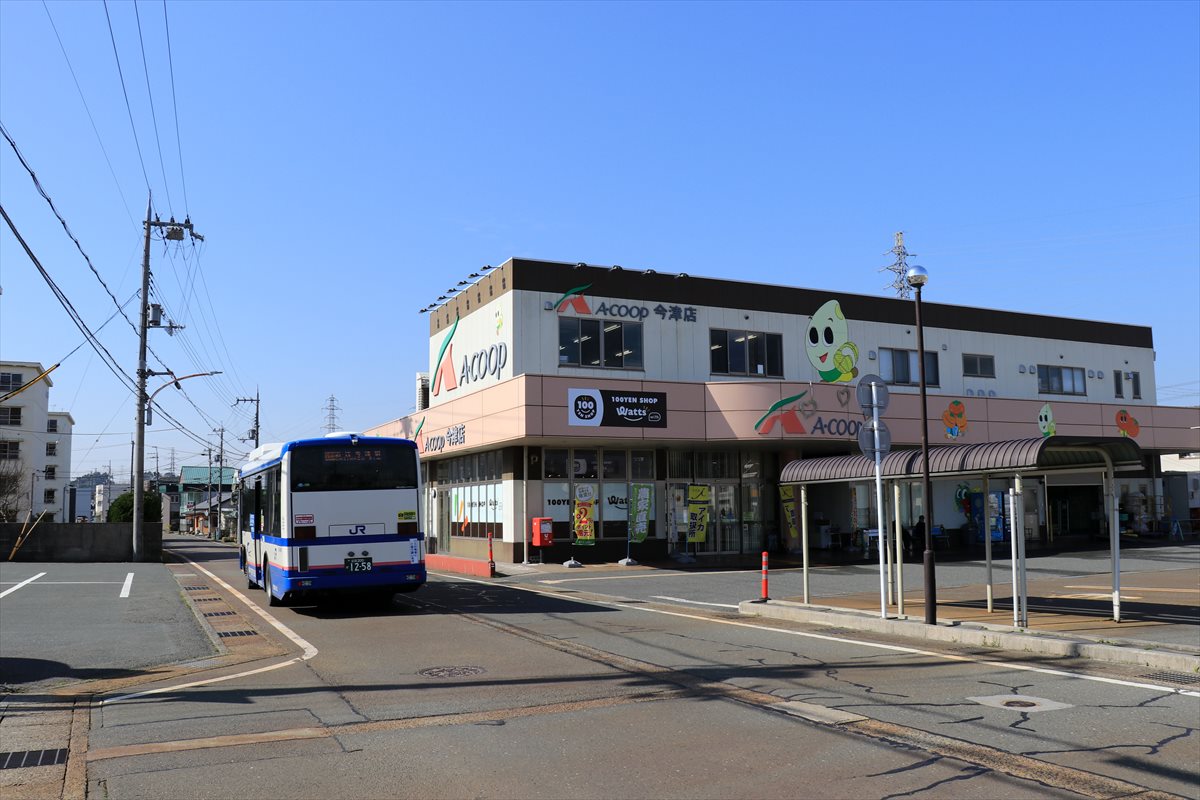乗り込んだ若江線のバスは近江今津駅行き……なんですが、今回は一つ手前の今津西町のバス停で下車しました。バス停には農協の施設が隣接していますが、この敷地は元々は大津と近江今津を結んでいた江若鉄道の旧近江今津駅(湖西線のものとは位置が異なる)が設置されていた場所だったりします。2019年まで当時の駅舎も残されていたらしいのですが、残念ながら老朽化で解体されてしまったようです。