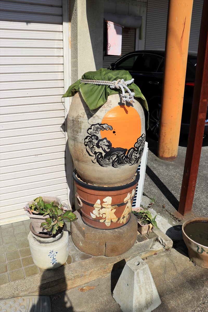 前日与謝で購入した2本がどちらも甘いので、やや辛め傾向の濃醇酒を……と希望しておすすめされたのが、今回購入した浅茅生の特別純米吟吹雪です。店先の酒樽に乗せて記念撮影。