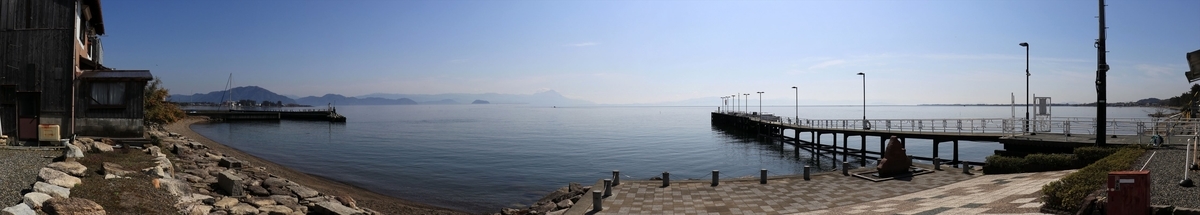 フェリー乗り場の横から琵琶湖の穏やかな湖面を臨む。若干霞んでいますが、伊吹山や鈴鹿山脈といった稜線が遠くに見えています。