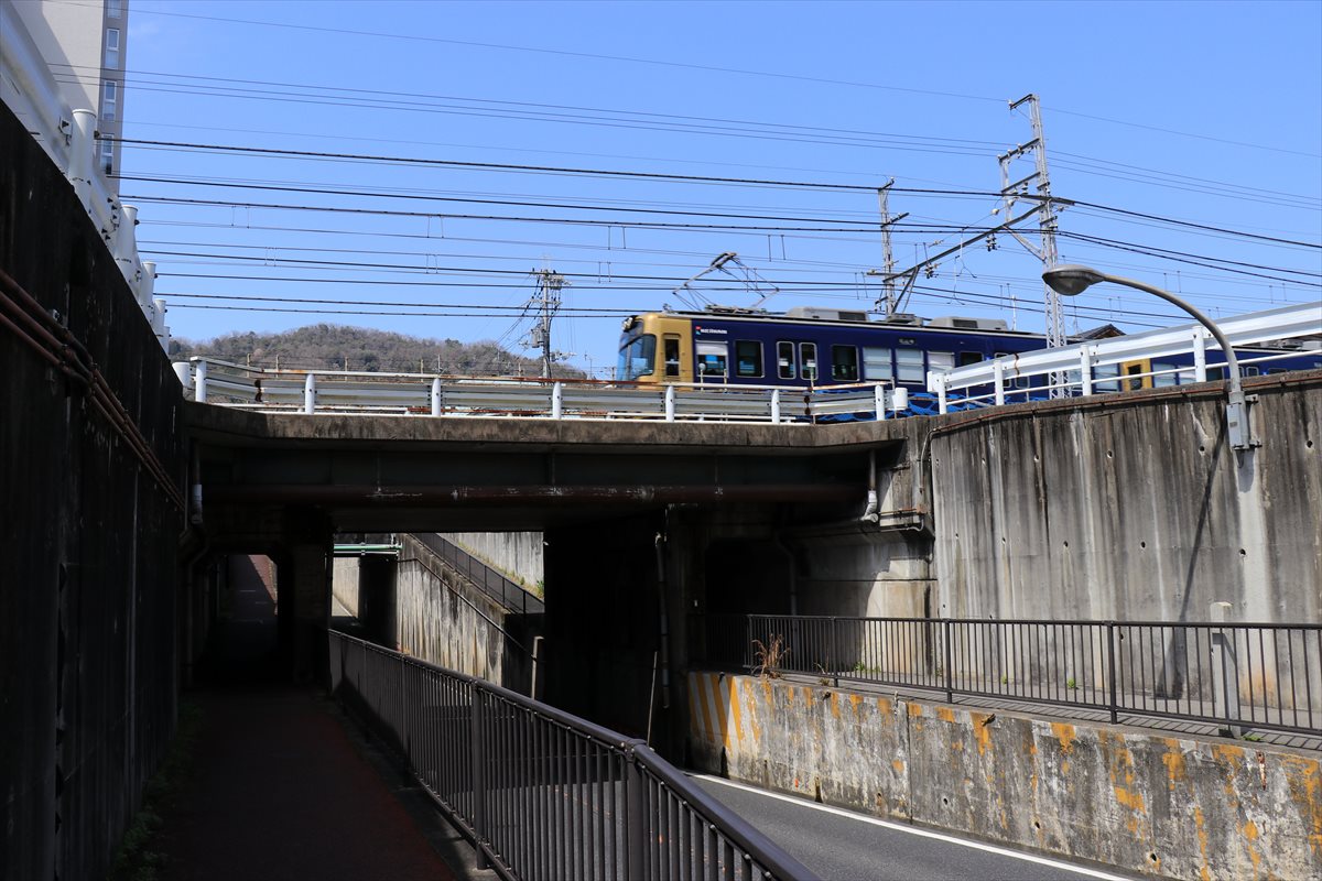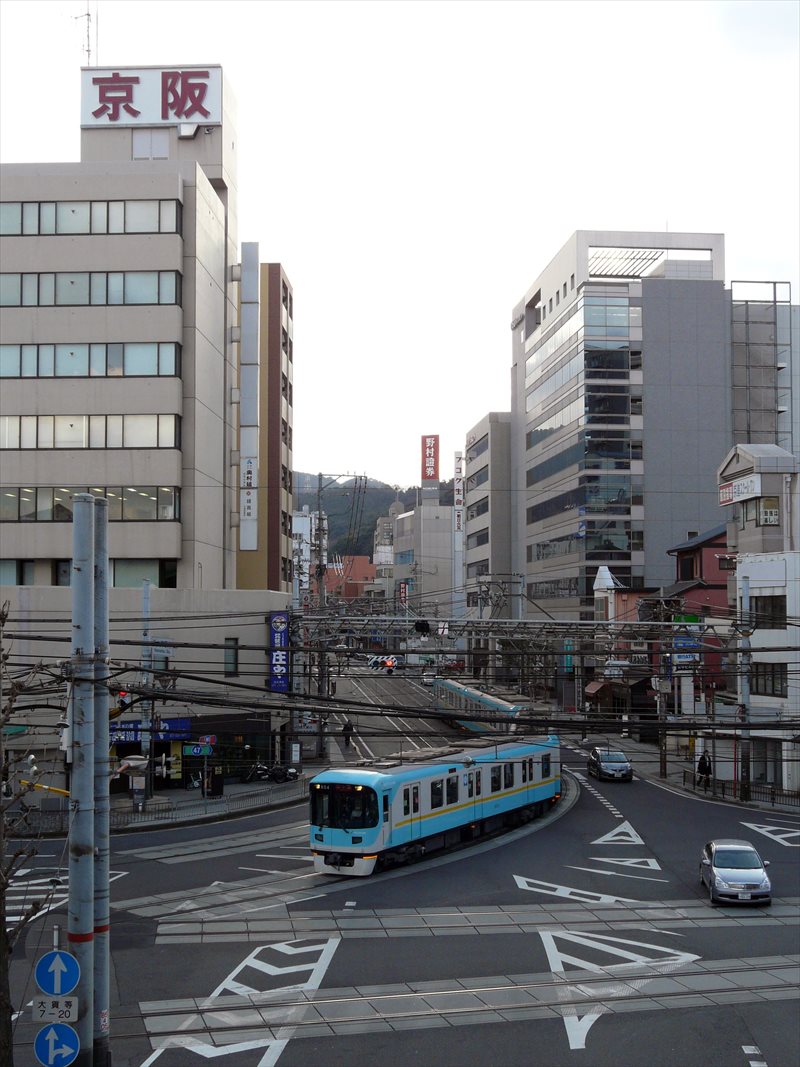 途中で併用軌道(所謂路面電車)の京阪京津線の線路を越えます。大津の市街地を貫くように通された京津線はこの付近のみ併用軌道となっていますが、短い路面電車タイプの車両ではなく4両編成の普通の電車(1両の長さは16.5mで、一般的な20mと比較すると若干短い)が路面上を走る、全国的にも珍しい区間として知られています。