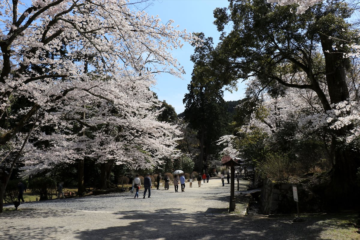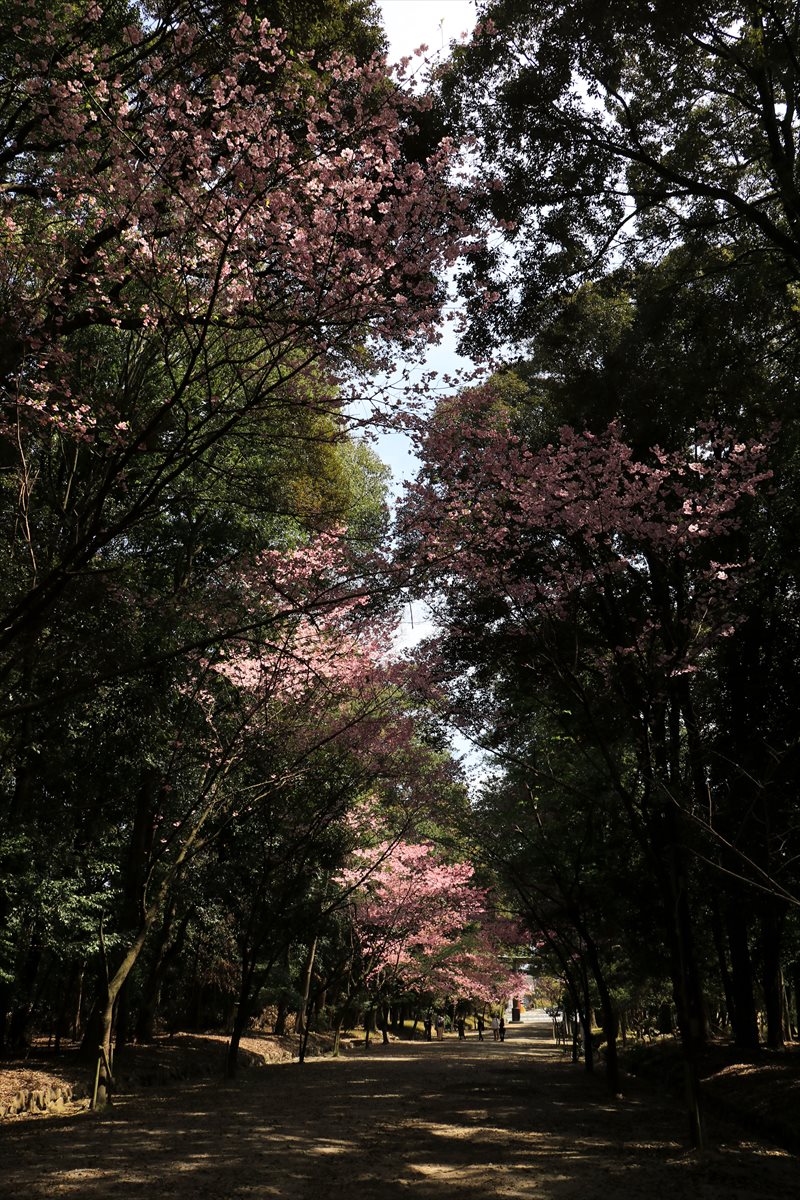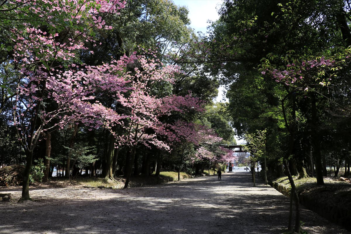 奥に見える一ノ鳥居から続く近江神宮の参道。桃色の濃い桜は陽光桜という品種らしいです。