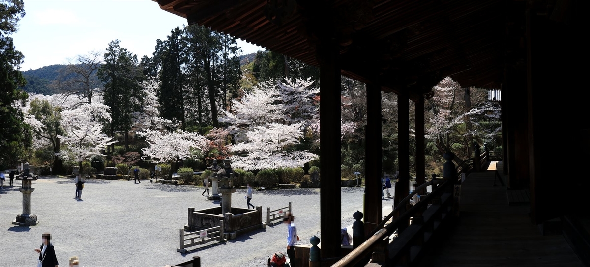 廊下から花見客で賑わう境内を臨む。