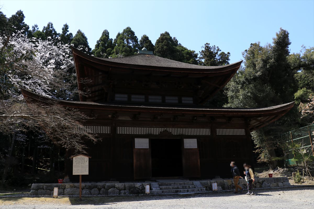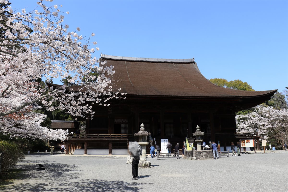檜皮葺の大きな屋根が美しい園城寺金堂。慶長の復興時の建築で、秀吉の没後に正室である高台院によって寄進されたもの。