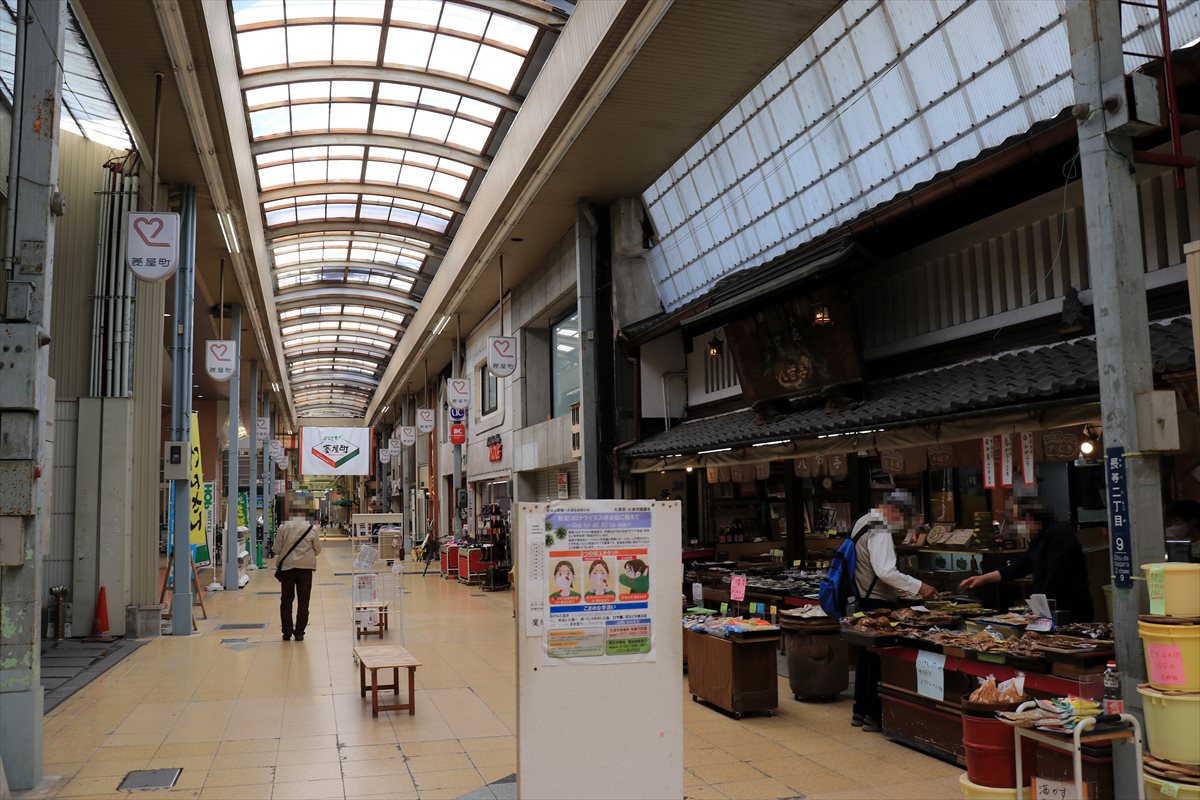 長等商店街の様子……県都大津の中心市街地と言えるような場所にあるのに昼間から薄暗く、開いている店も疎ら。しかし中には近江今津で見掛けたような川魚の佃煮や鰻を扱う店も幾つか。