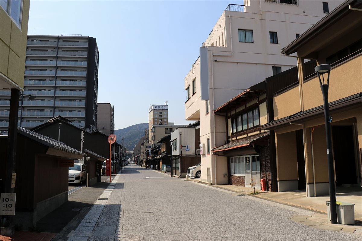 先程歩いてきた中町通りの一本南側の京町通り(旧東海道)の様子。宿場町時代の遺構はあまり残っていないらしいですが、路面はそれっぽく石畳調になっている。出張民にとっての旅籠とも言える東横インが奥に見えるのは宿場の名残か。