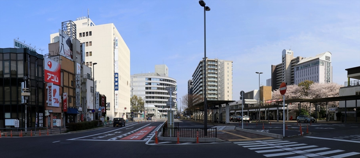 大津駅の駅前ロータリーの様子。周辺は県庁や裁判所が立ち並ぶ官庁街となっており、県庁所在地を代表する駅としては至極静かな雰囲気。