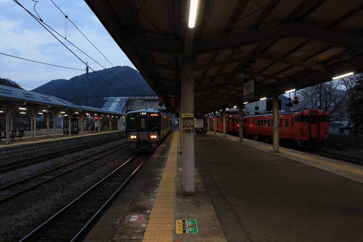 播但線の終着である和田山駅に到着。この駅で山陰本線に乗り換えとなります。時刻は既に18時を回り、辺りは次第に薄暗くなりつつある。