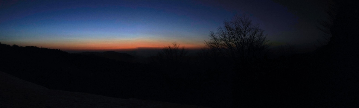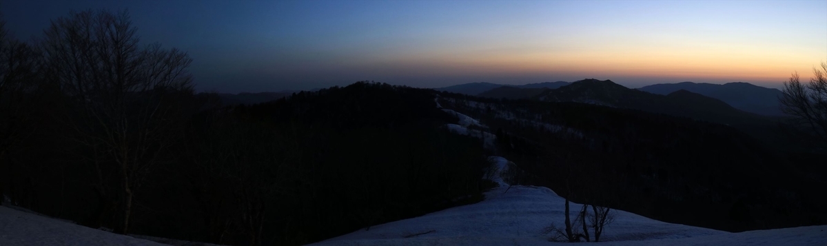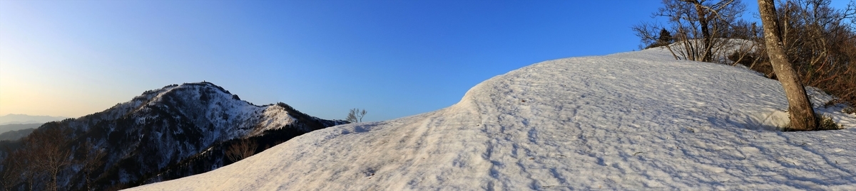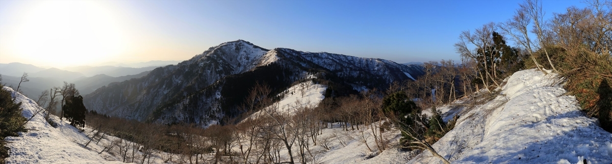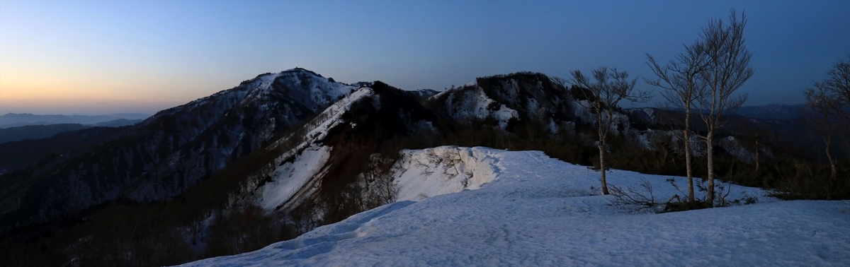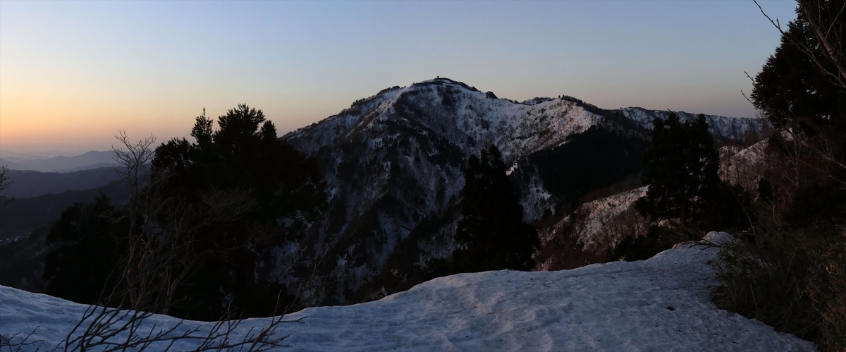 避難小屋から始まる登り坂を一頻り登りきった所が布滝頭のピークです。この頃になると雪面ではヘッドライトが不要な程度には明るくなり、これから向かう赤倉頭、赤倉山、氷ノ山と続いていく稜線が見渡せるように。