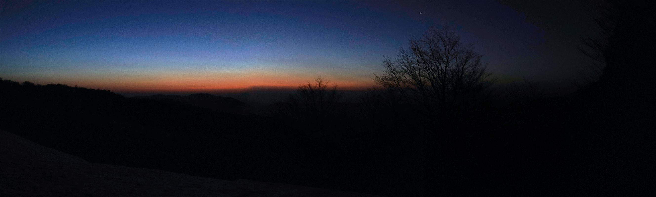 徐々に赤味が強まりつつある東の空。左側の木が掛かっている山が鉢伏山で、その手前のハチ高原には幾つかの建物の灯りが見える。
