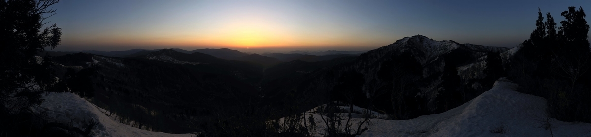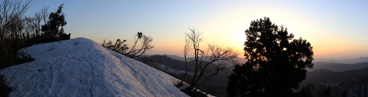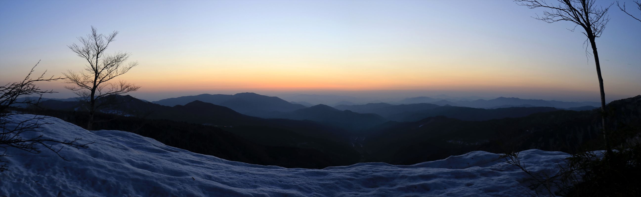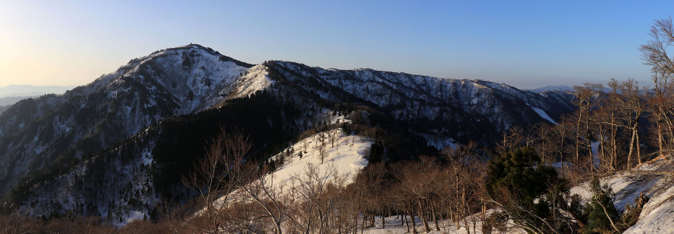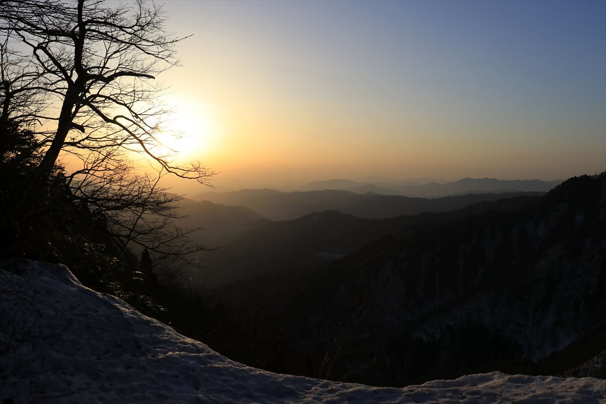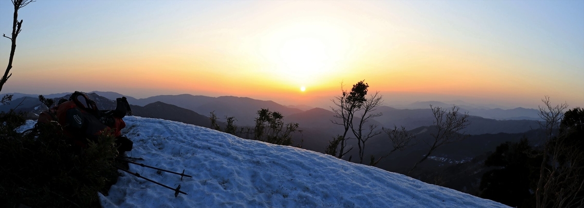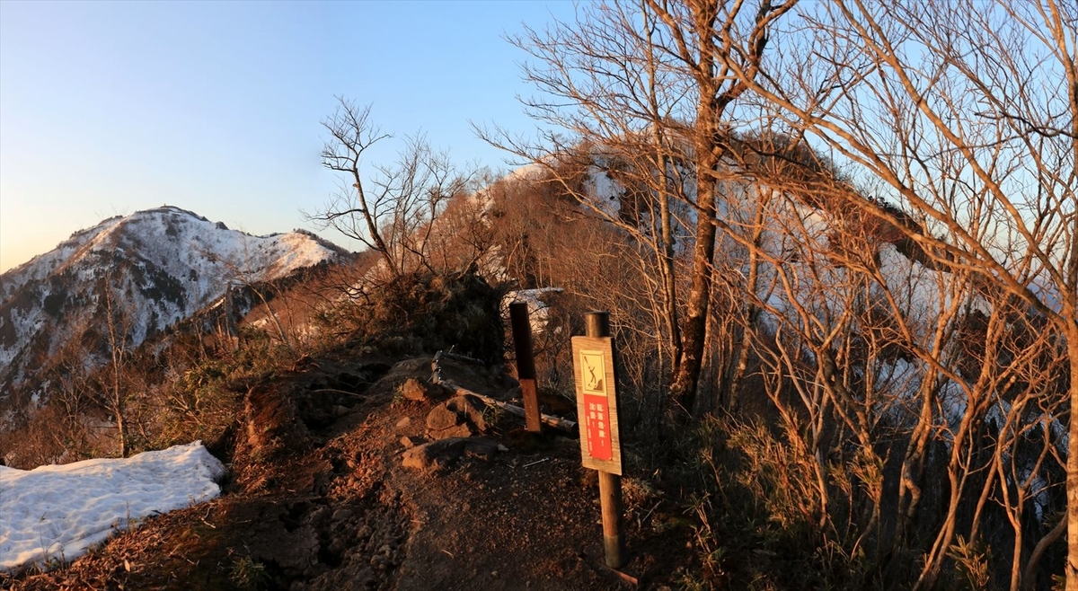 前日宿泊した大平頭避難小屋を未明に出発した後は稜線沿いに進んでいき、途中の赤倉頭にて日の出の見物。その後は赤倉山に登頂し、以降は氷ノ山への纏まった登り返し。途中の甑岩のトラバースにて少々難儀したものの無事に氷ノ山の山頂に到着。360度の展望を堪能した後は尾根伝いに三ノ丸、そして舂米集落にあるわかさ氷ノ山スキー場のゲレンデに下山。