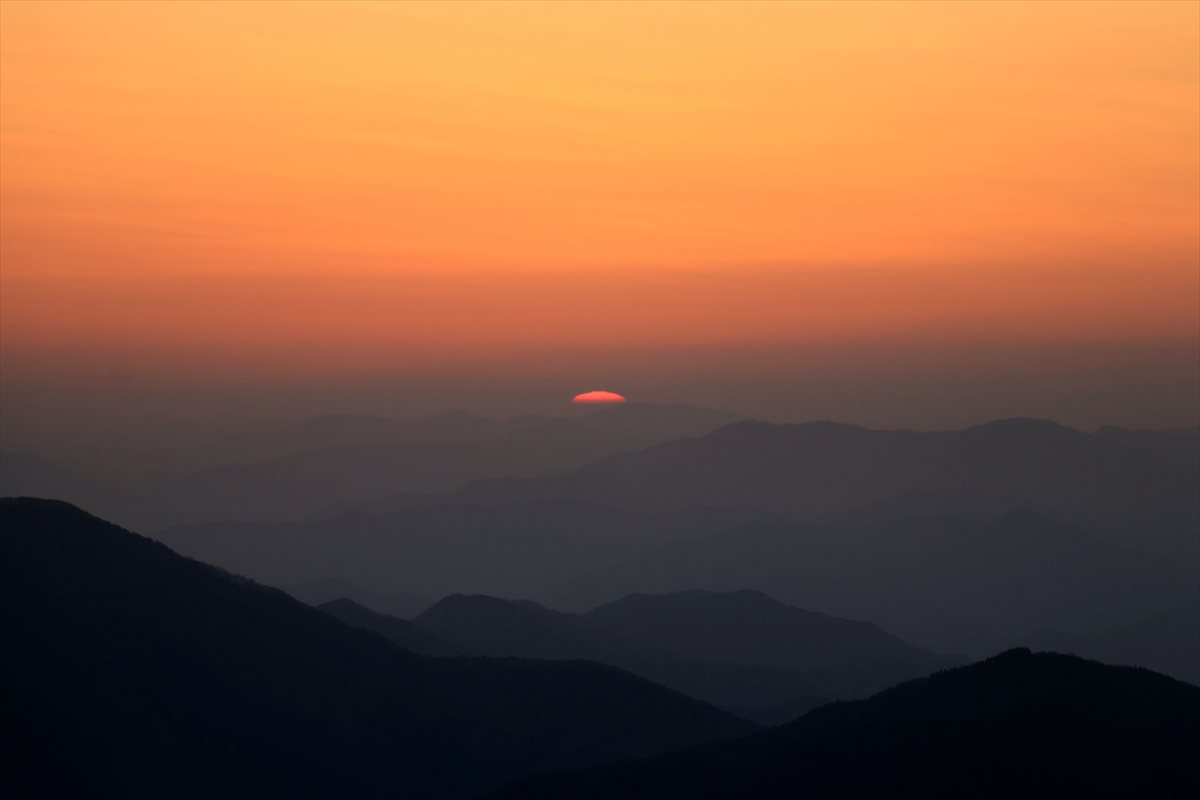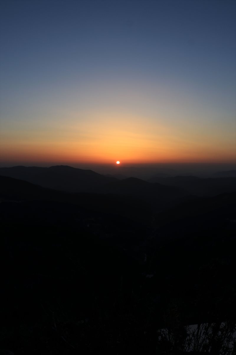 若干露出を上げて撮ってみたもの。つい少し前まで闇の中にあった周囲の山々に陽光が降り注ぐ。