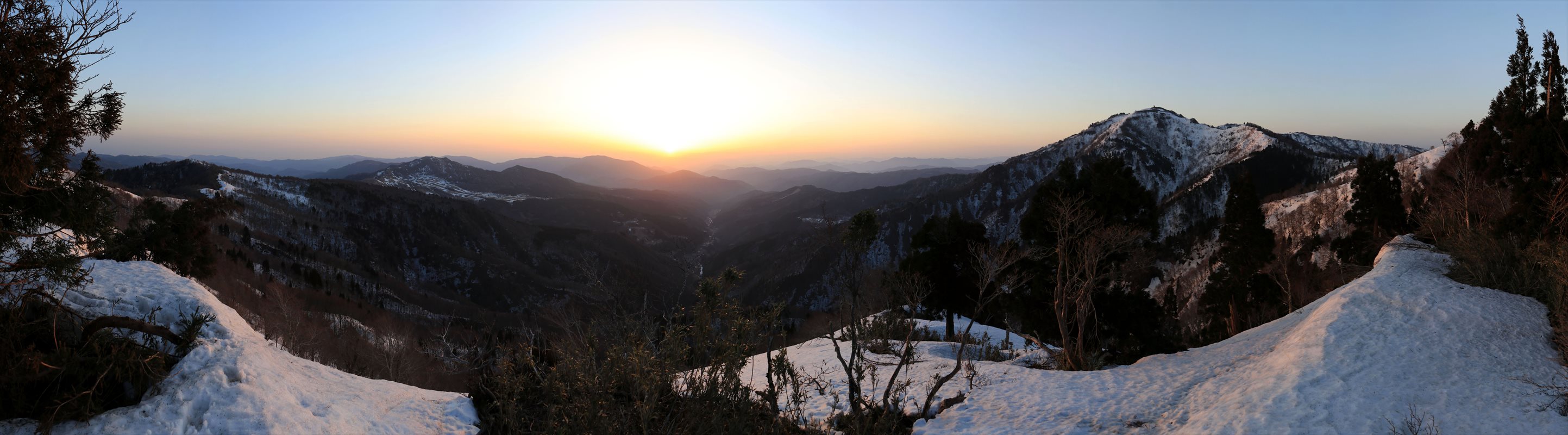 日の出と周囲の展望。ここも例によって崖っぷちが雪庇になっているので、あまり近付けない。