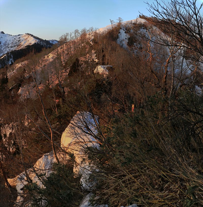 少し進んだ所から赤倉頭を振り返った所。雪が積もっているので容易に登頂できましたが、夏場は藪に覆われていると思われる。