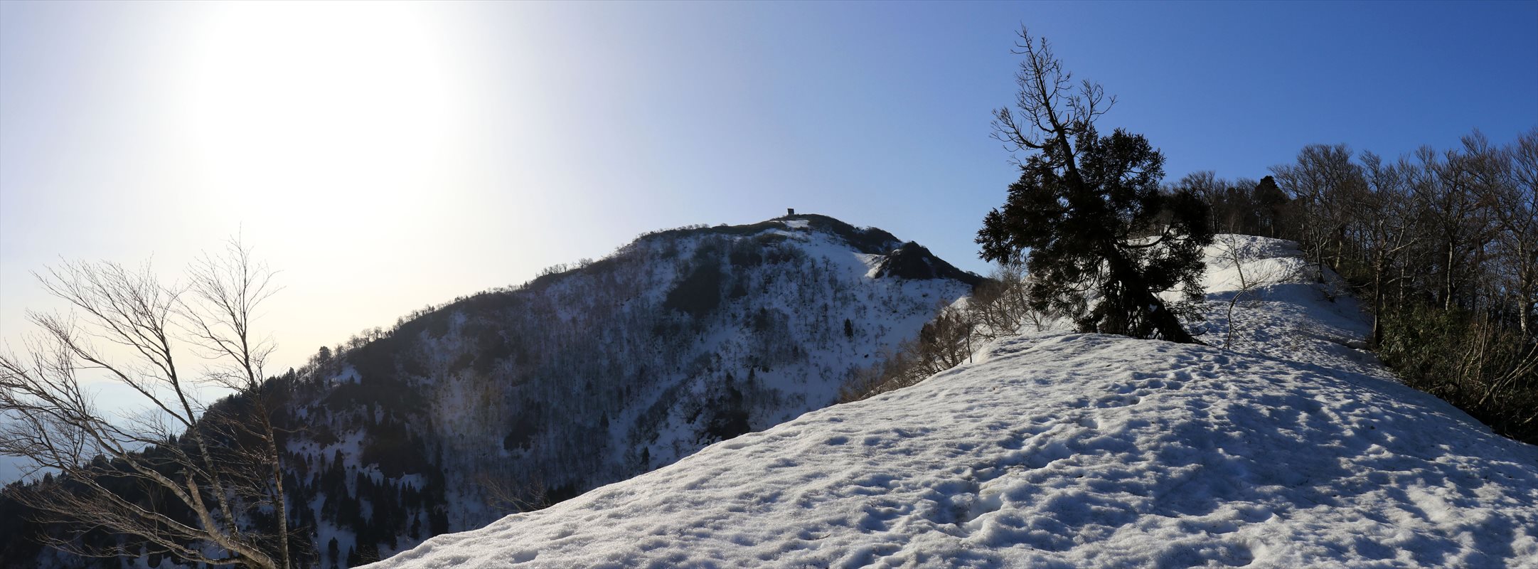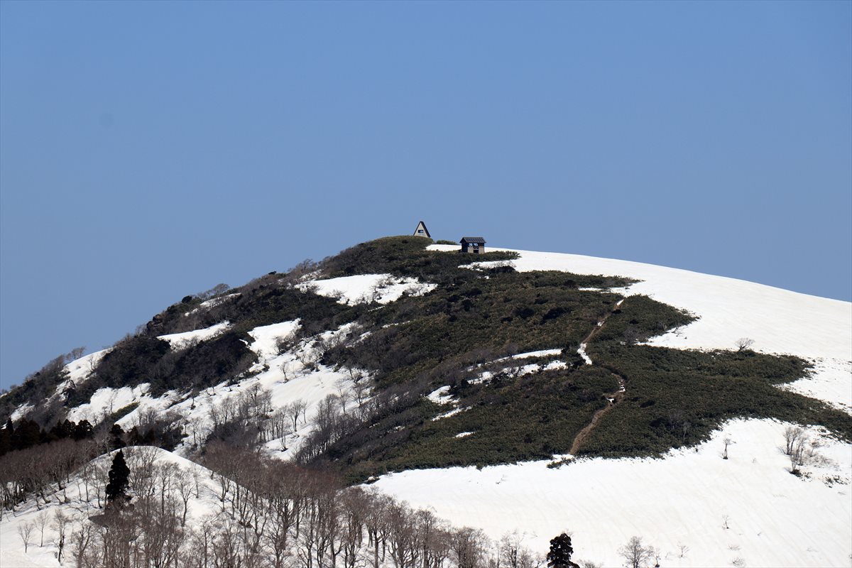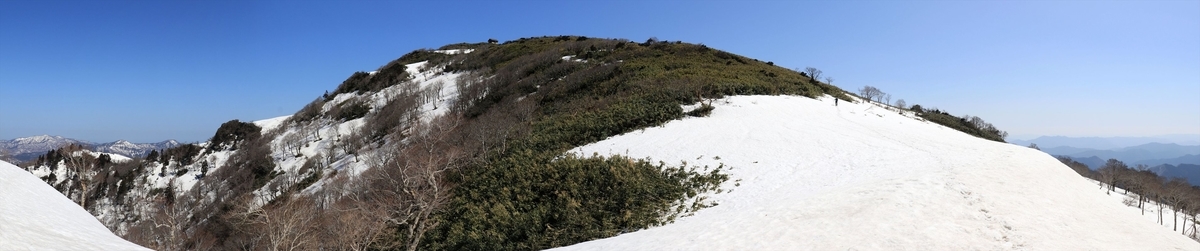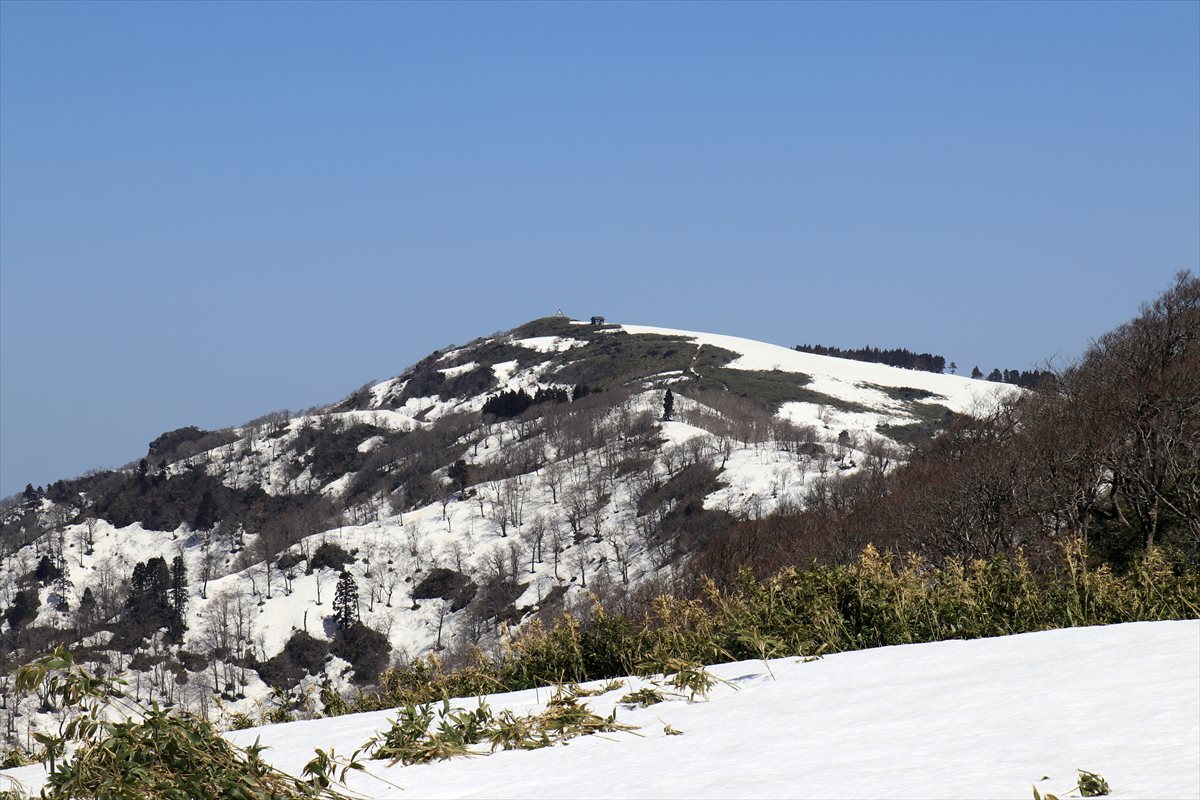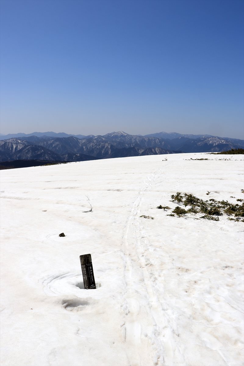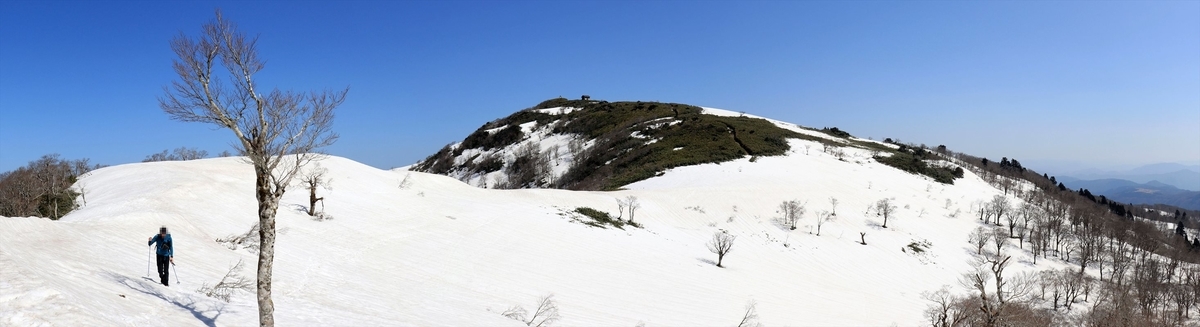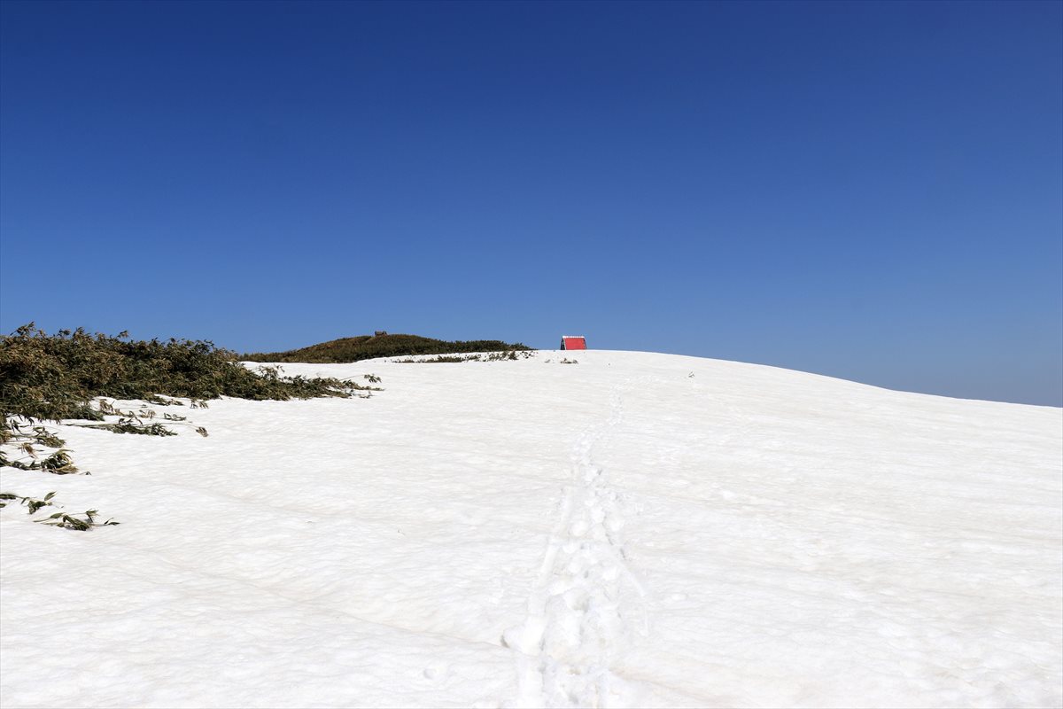 氷ノ山から氷ノ山越を挟んで北側に位置する赤倉山に到着。氷ノ山を間近に見据える好ロケーションですが、正規のコースはこのピークを経由せずトラバースするように取り付けられています。つまり、こちらも積雪期限定に登れる山とも言える。