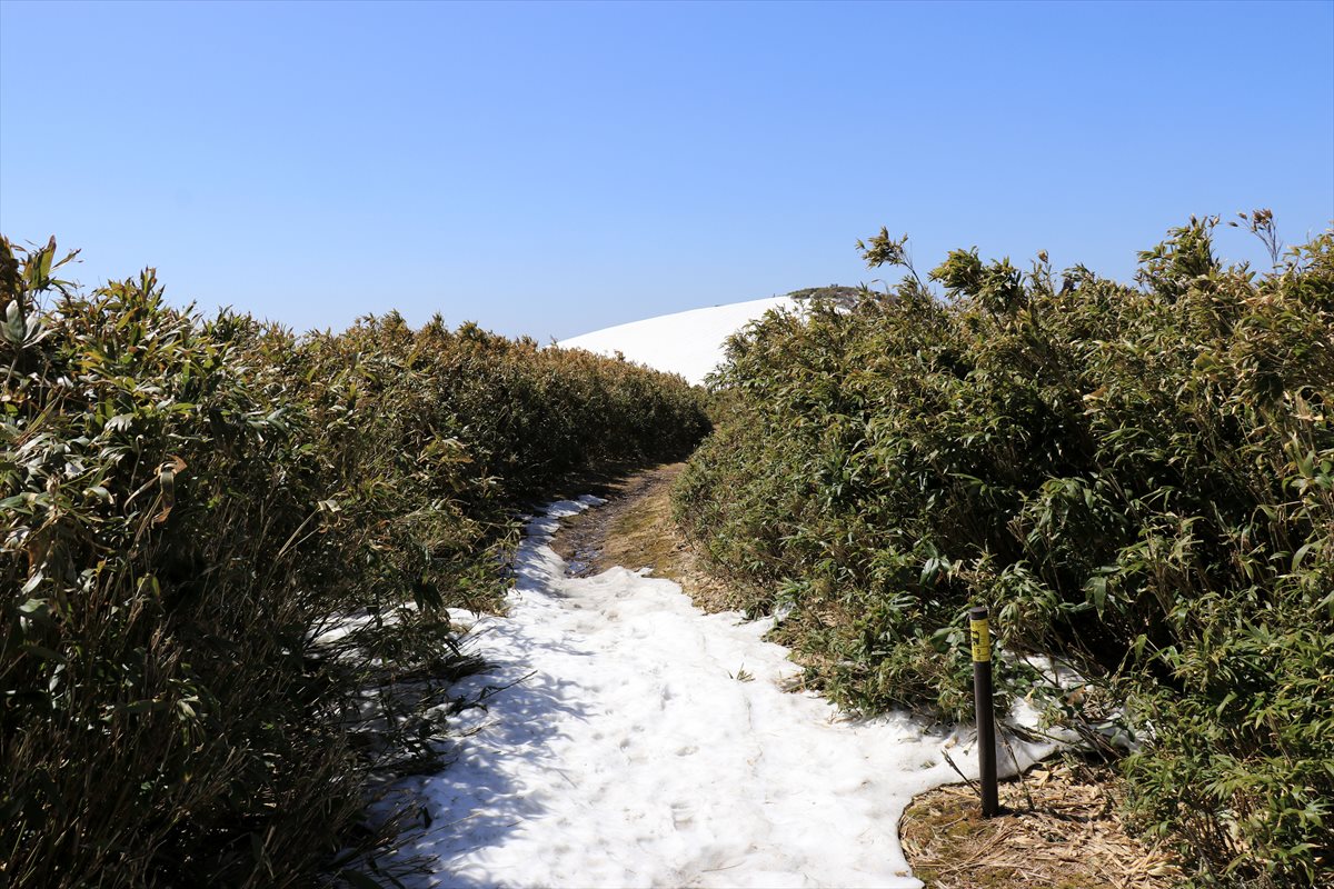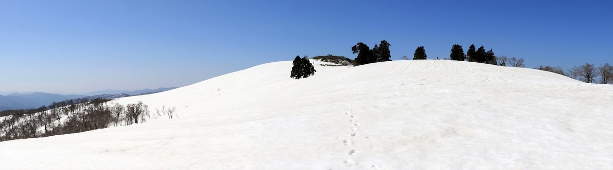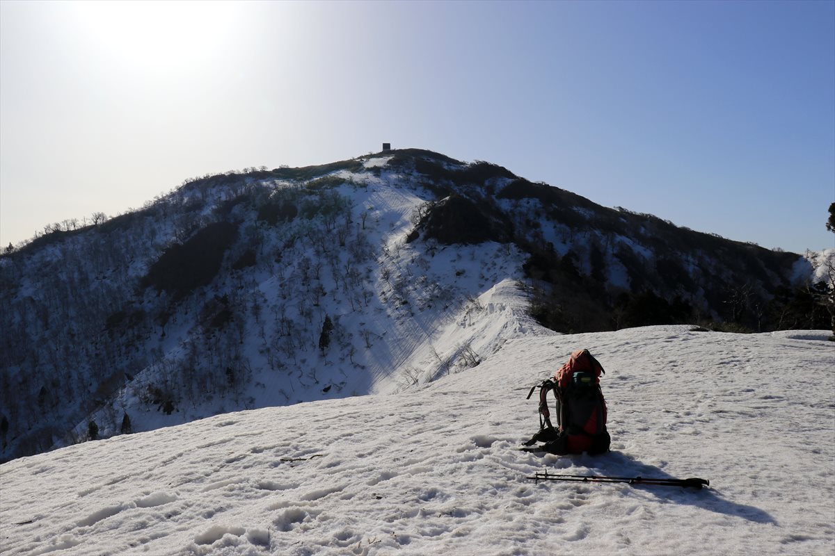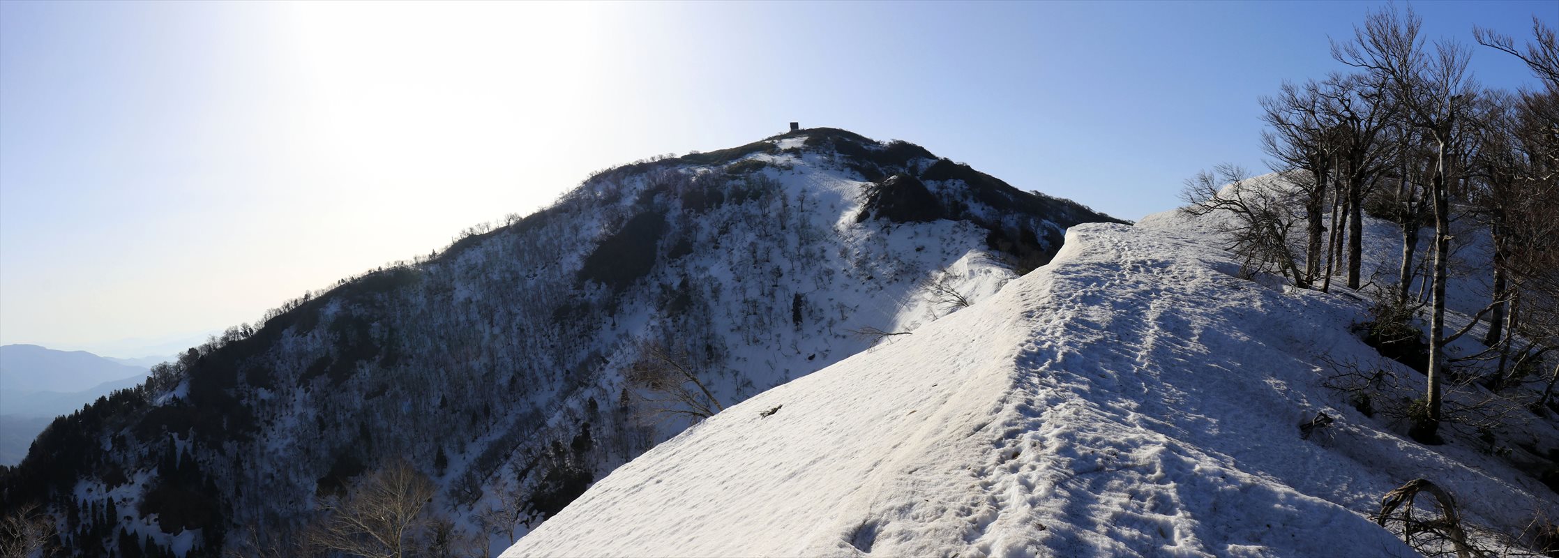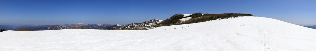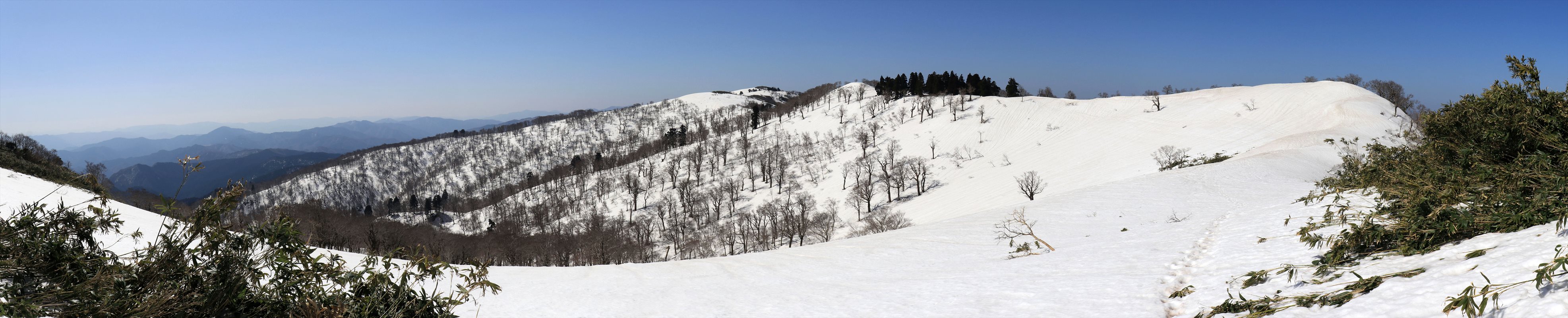 氷ノ山から氷ノ山越を挟んで北側に位置する赤倉山に到着。氷ノ山を間近に見据える好ロケーションですが、正規のコースはこのピークを経由せずトラバースするように取り付けられています。つまり、こちらも積雪期限定に登れる山とも言える。