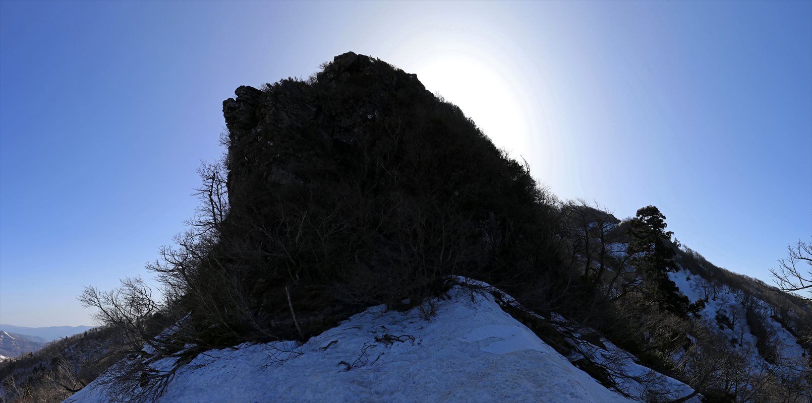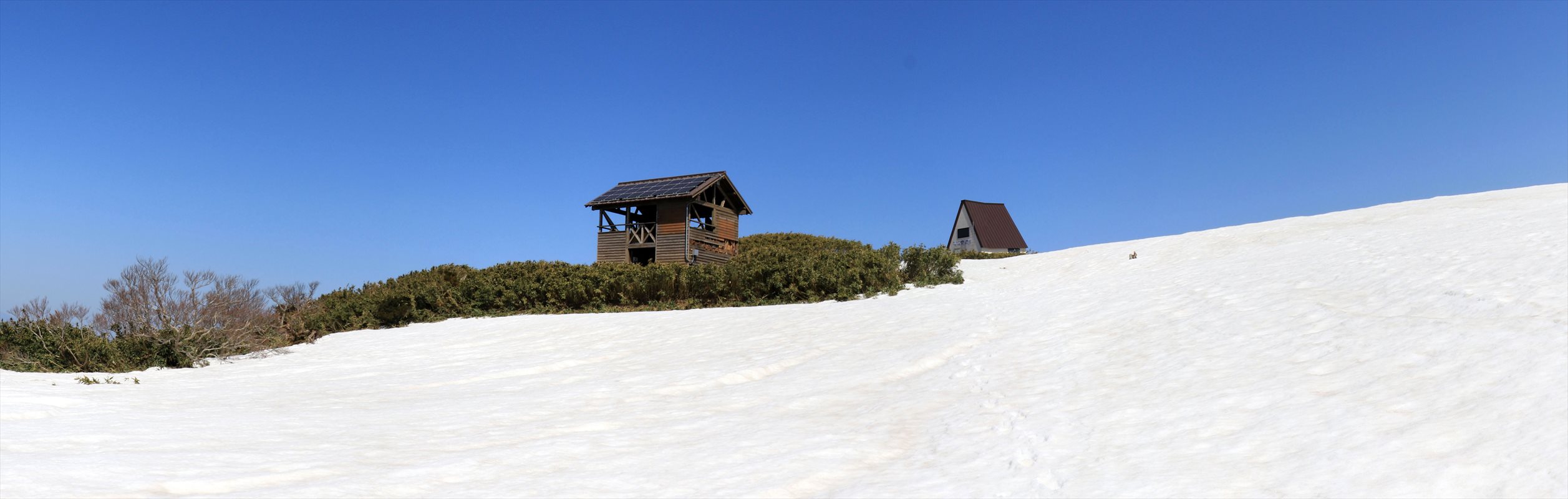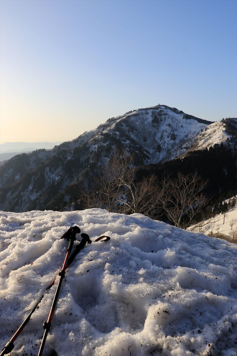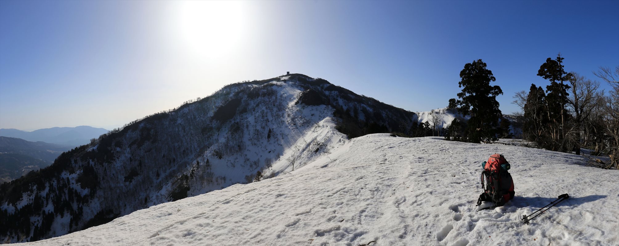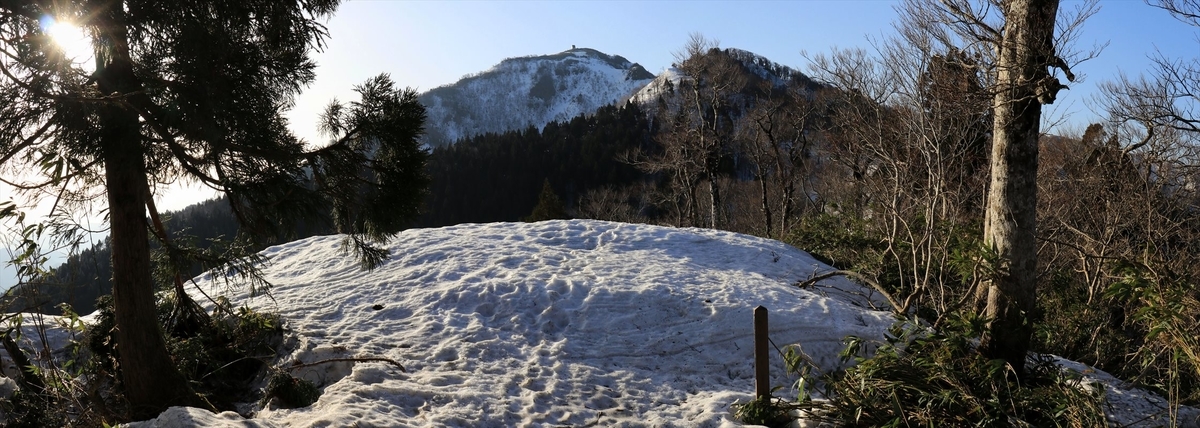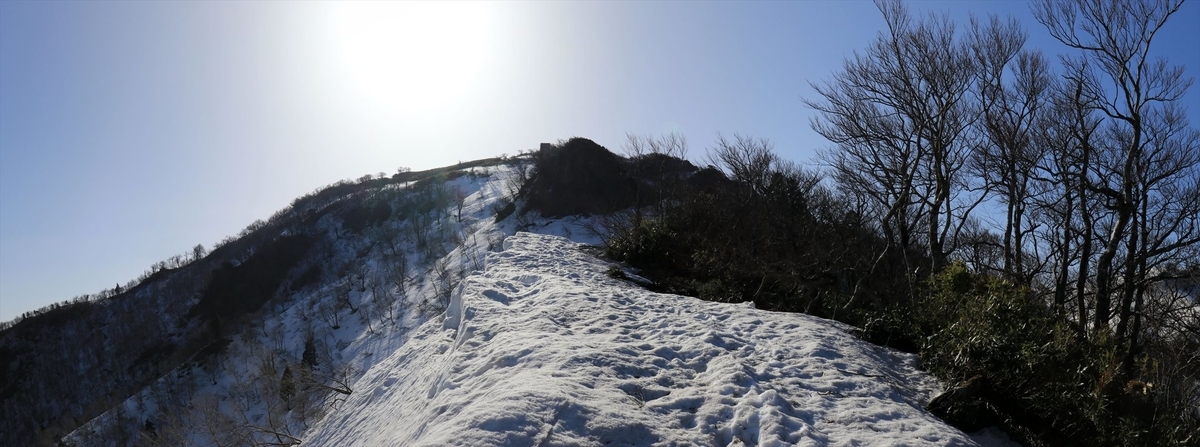 氷ノ山から氷ノ山越を挟んで北側に位置する赤倉山に到着。氷ノ山を間近に見据える好ロケーションですが、正規のコースはこのピークを経由せずトラバースするように取り付けられています。つまり、こちらも積雪期限定に登れる山とも言える。