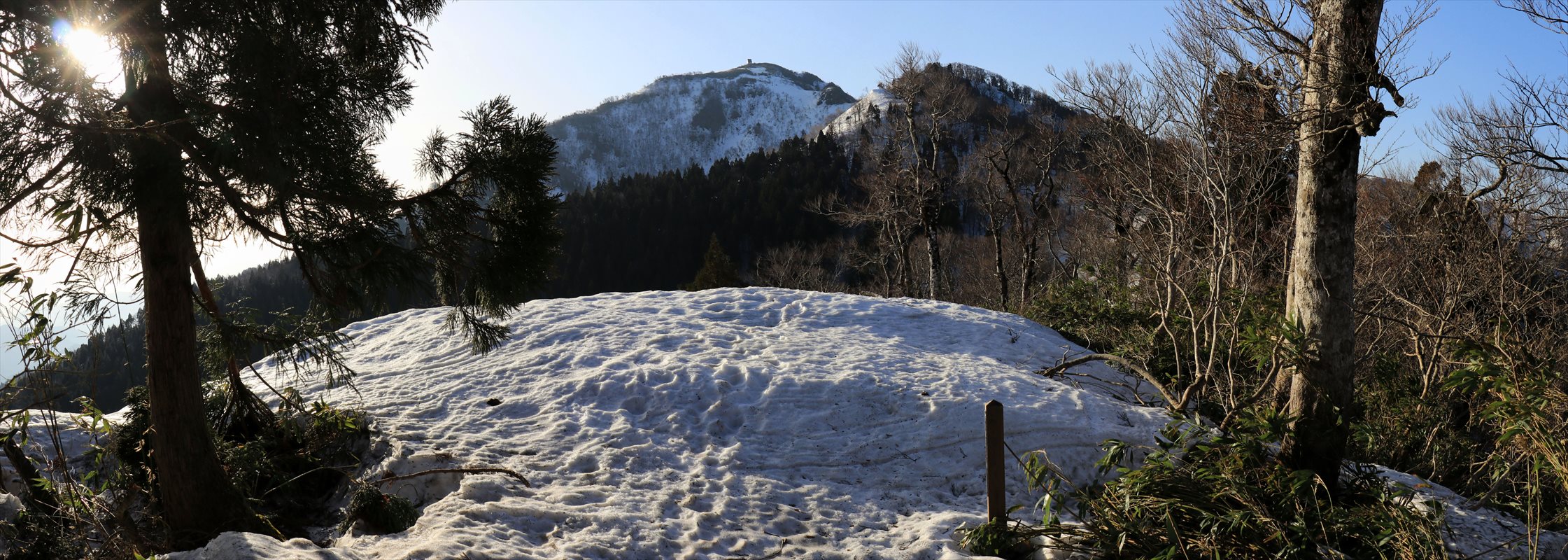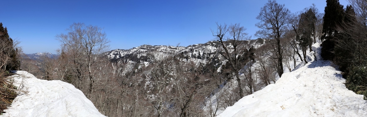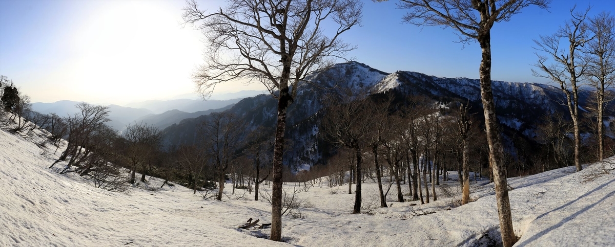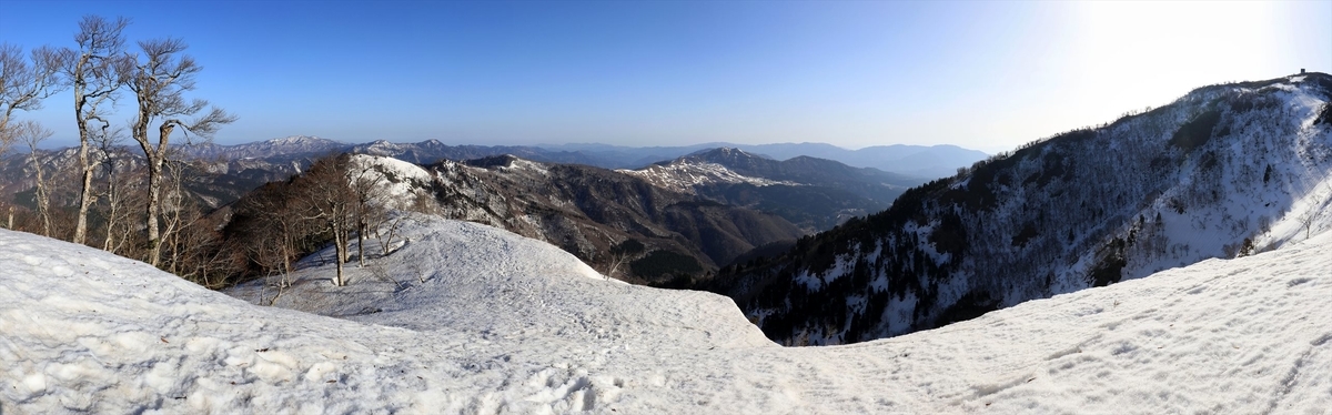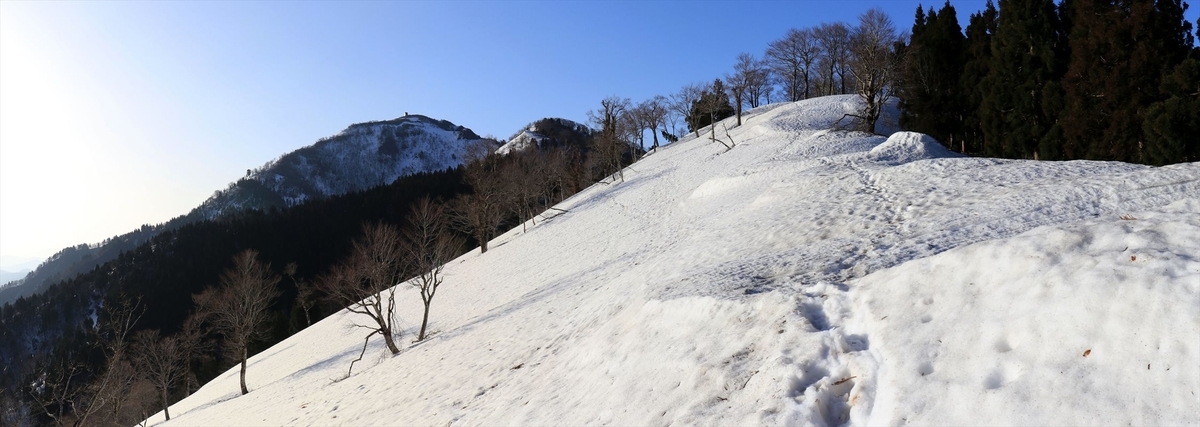 これまで歩いてきた大平頭、鉢伏山と続く稜線。一定以上の標高からほぼ雪道となりました。