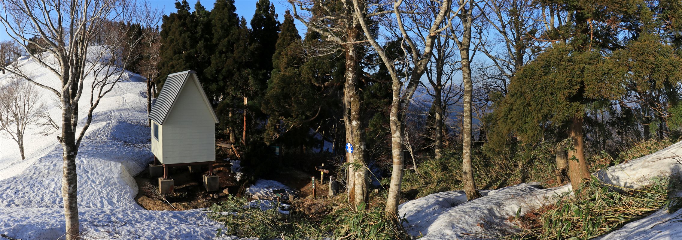 鞍部の氷ノ山越に到着しました。氷ノ山と赤倉山の間の一段低くなった所で、この日の出発地である大平頭避難小屋と同形の小屋が設置されています。