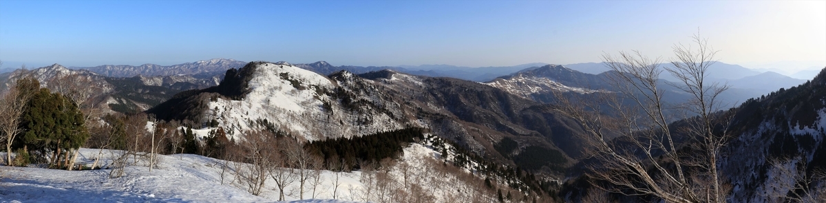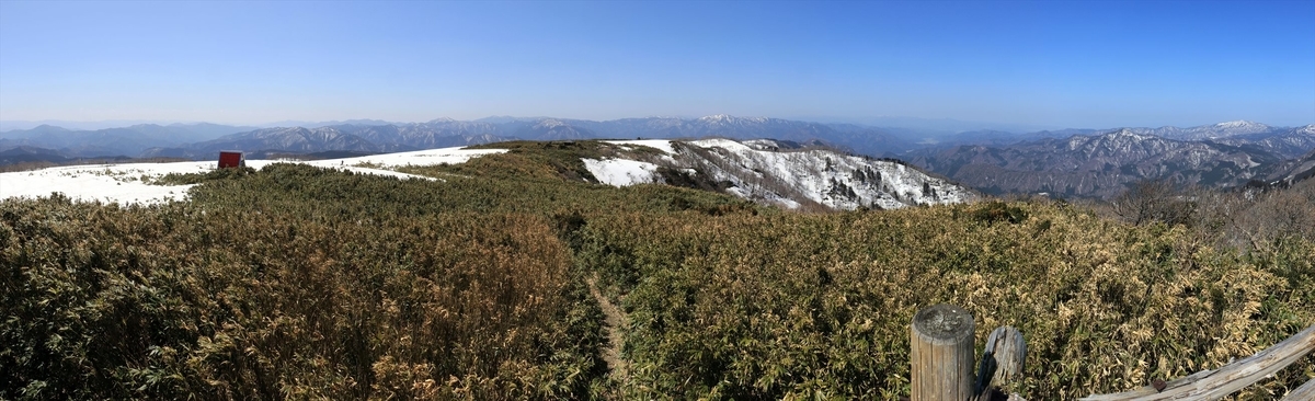 これまで歩いてきた方面を振り返る。正面に見えるのが赤倉山や氷ノ山越へと続く稜線で、前日登った鉢伏山も少し距離を挟んで右の方に見えています。赤倉山背後の扇ノ山も存在感があり、屏風のように稜線が続いている。