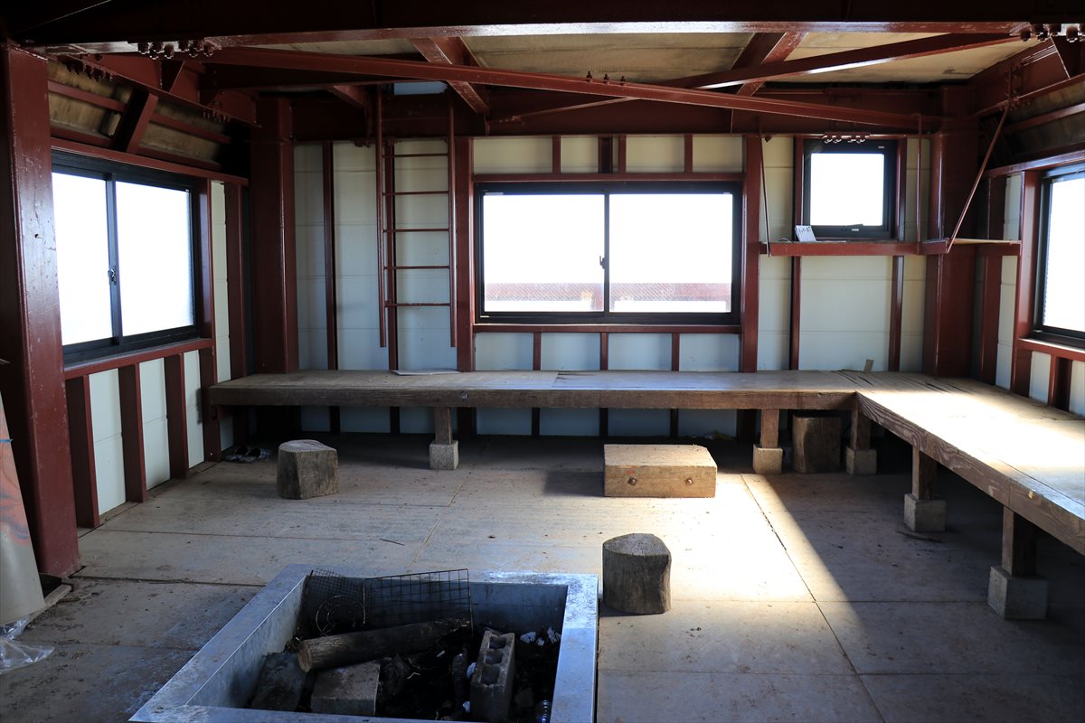 大平頭避難小屋より幾らかグレードが高そうな氷ノ山避難小屋の室内の様子……二階も存在し、奥の梯子で登り下りします。ベンチの幅も広く、寝返りを打って落ちる心配が要らないのは良いですね。