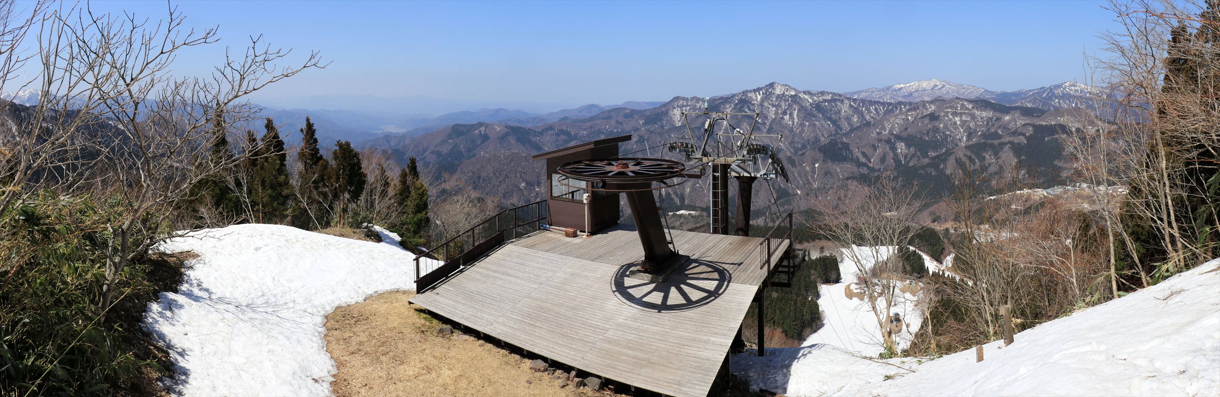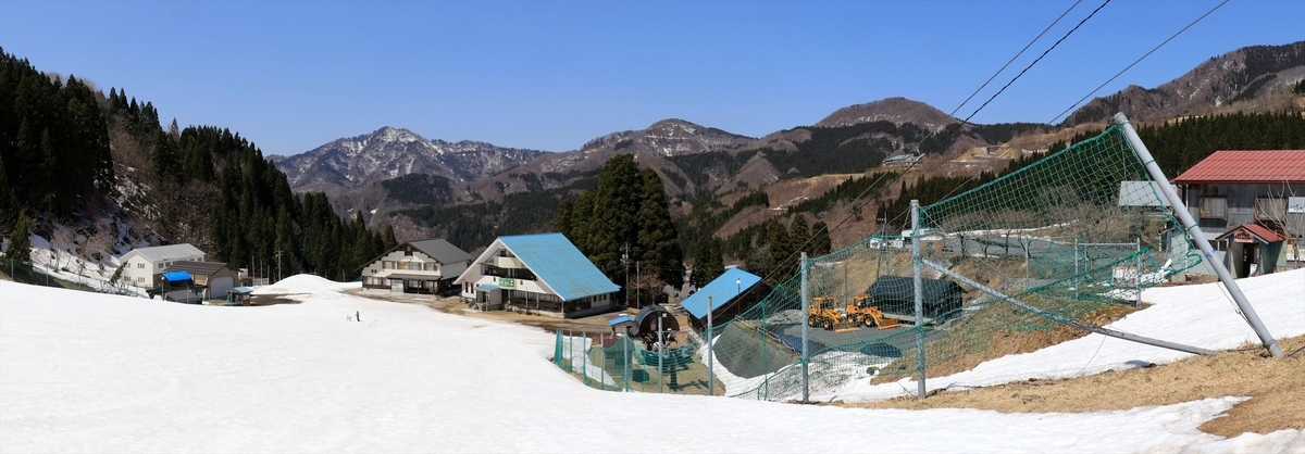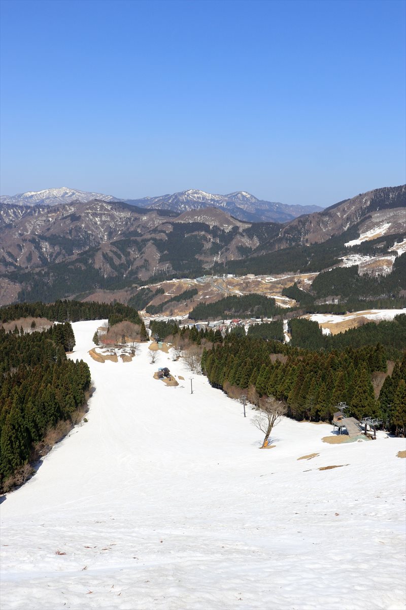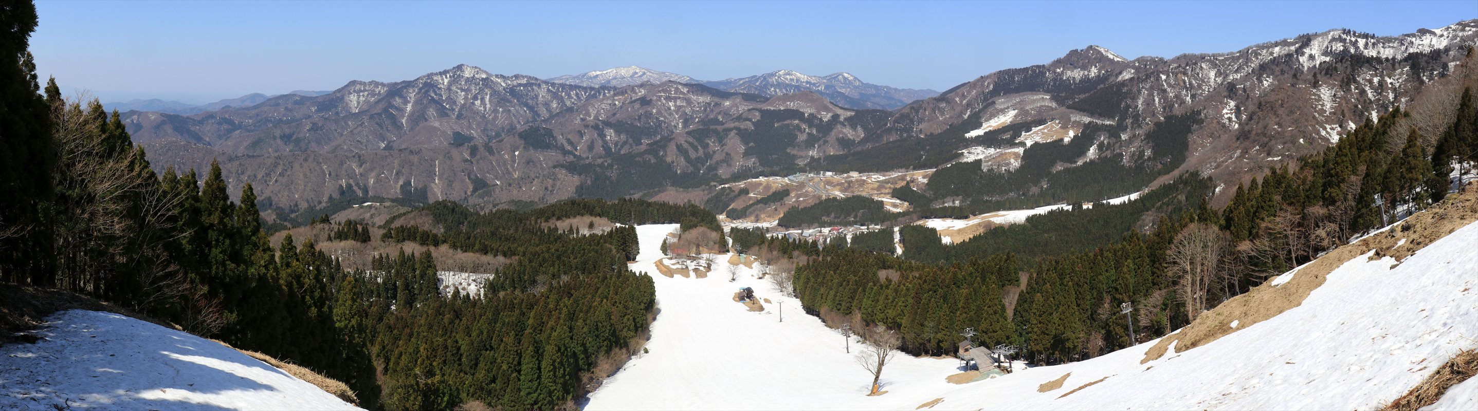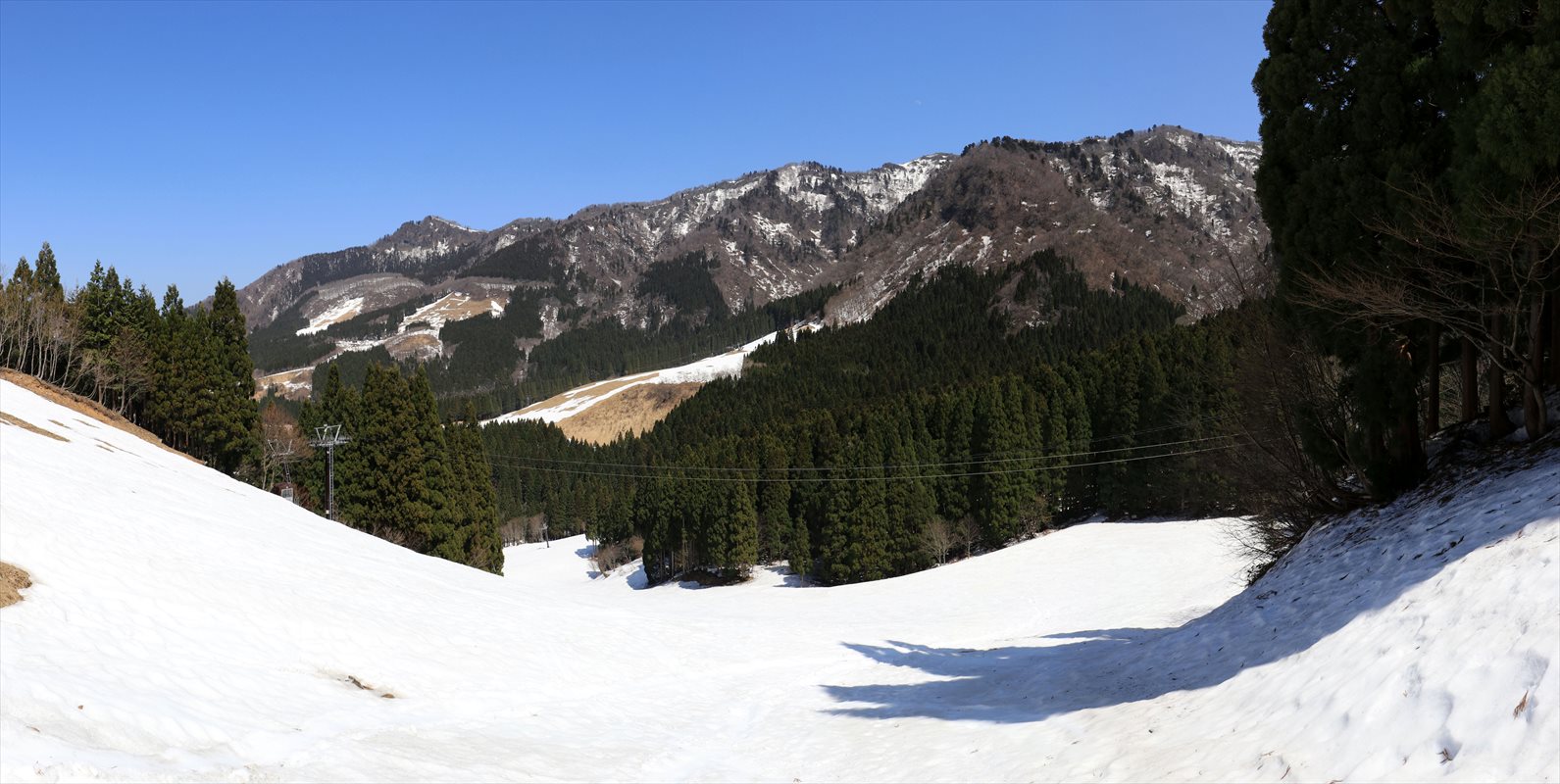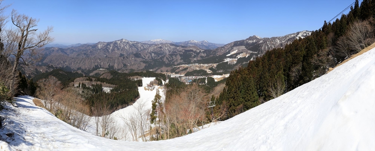 スキー場と周辺の山々の様子。リフトは動いてないものの雪の量は十分豊富で、板を担いで自力で登っている人の姿も見掛けた。