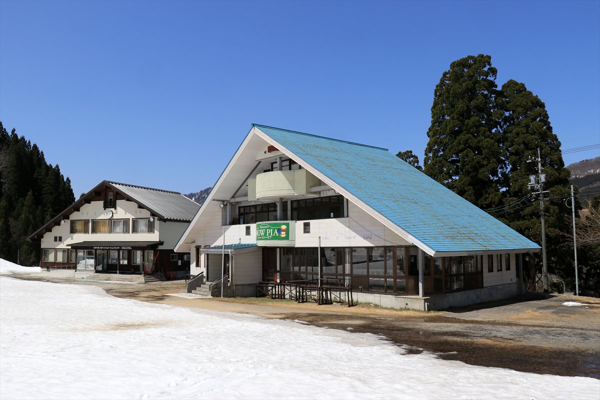 スキー場の入口付近の様子。戦前から存在するスノーリゾートという事で、一帯はリゾート地にしては若干古色蒼然とした感じを受けます。右奥の白い山が先程登った氷ノ山で、山頂に建つ避難小屋も確認できる。