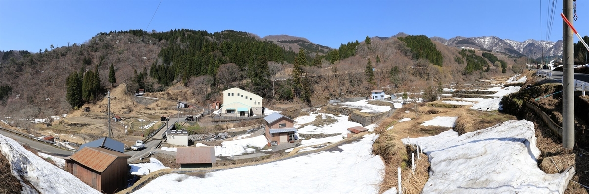 棚田の全景。所々で雪に埋もれていて全容の把握は難しいですが、山間の緩やかな傾斜地を利用して作られている様子が分かる。