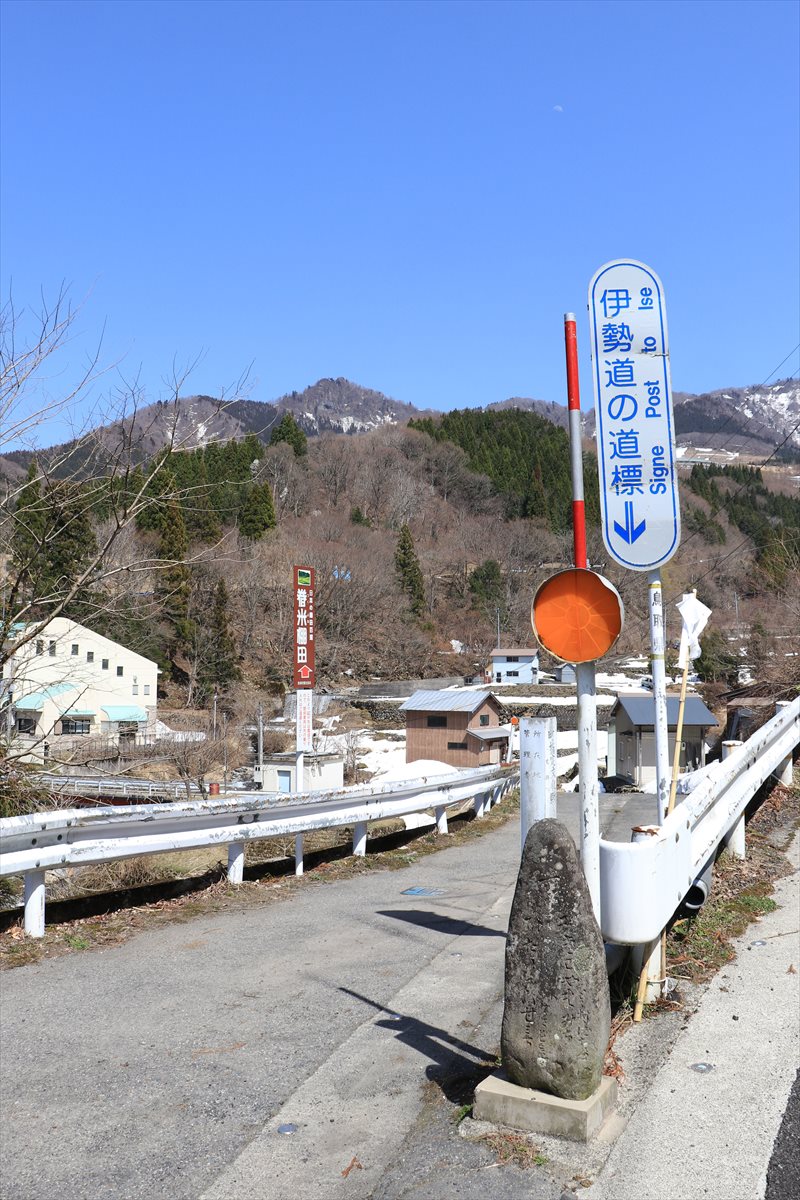国道上からかつての街道と思われる道を見下ろす。舂米の集落は東西に長く、江戸時代に伊勢参りの参詣客で賑わっていた頃は宿場の機能も持っていたとされています。