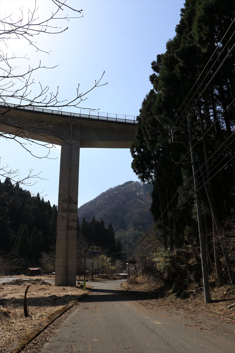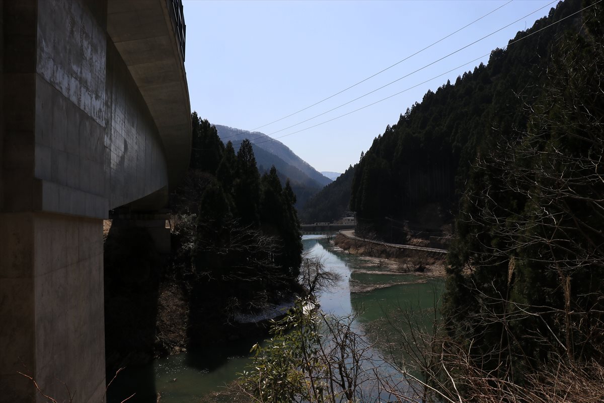 茗荷谷の集落を抜けた先には茗荷谷ダムがあります。左上の橋脚は舂米から先の分岐でトンネル方面の伸びていた新道で、集落の入口となるこの付近で旧道と接続しています。