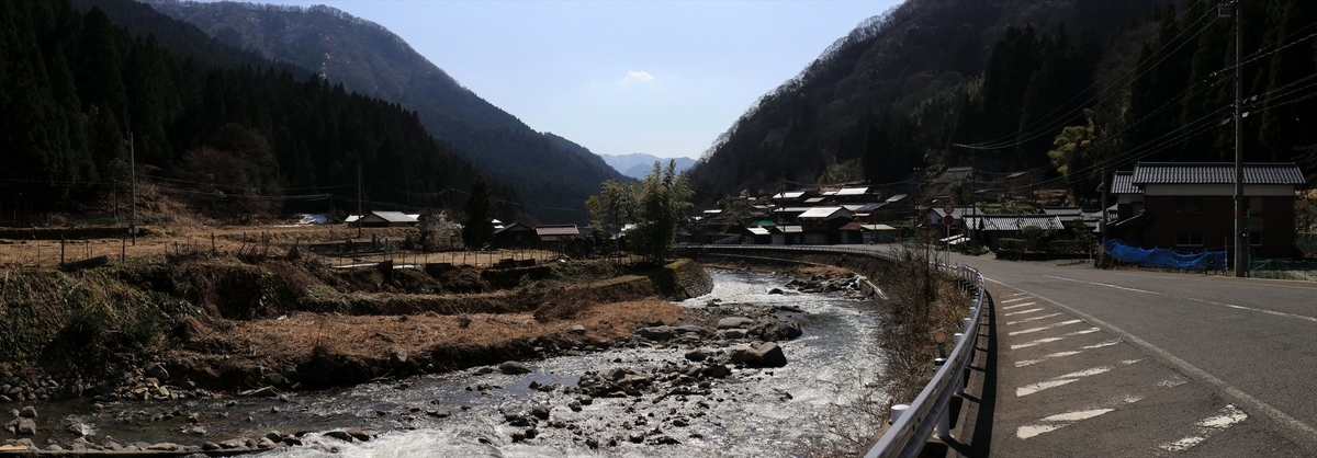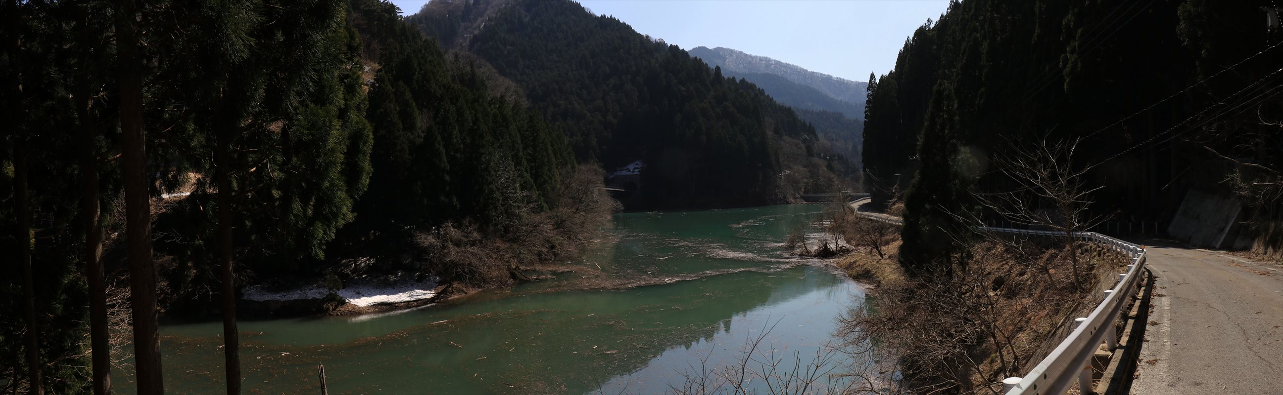 渕見の集落の様子。川沿いの長閑な集落という風情ですが、歩いていると突然ダムの放流警報が鳴り始めて静寂は打ち破られる……警報なので当然ですが中々の轟音。