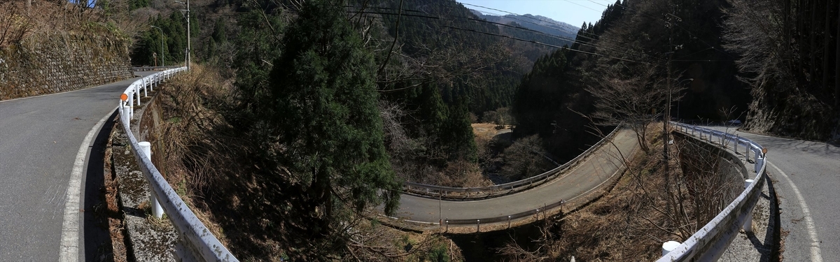 ダムの少し先の九十九折のカーブの様子。ダムの高さの分、一気に高度を下げていく。