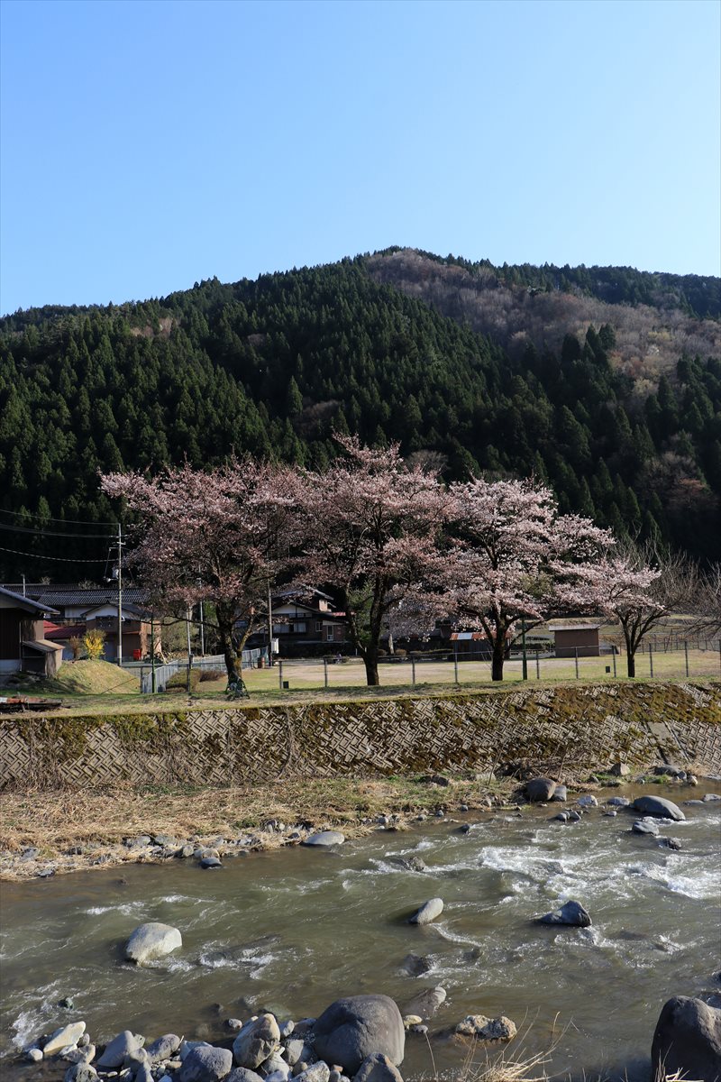 舂米川の川岸、香田集落の桜。2003年に改称されるまでは不香田(ふこうだ)という名の集落でしたが、不幸を連想させられ縁起が悪いと住民から変更を求められて現在の名となったという。