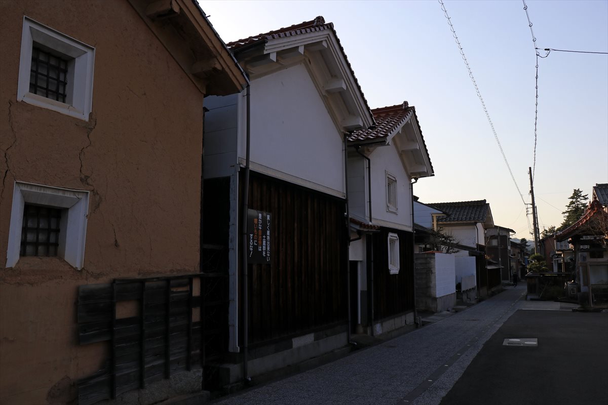 切り妻型の土蔵が立ち並ぶ様子。既に日没近くで陰がちになってしまったのが惜しい。