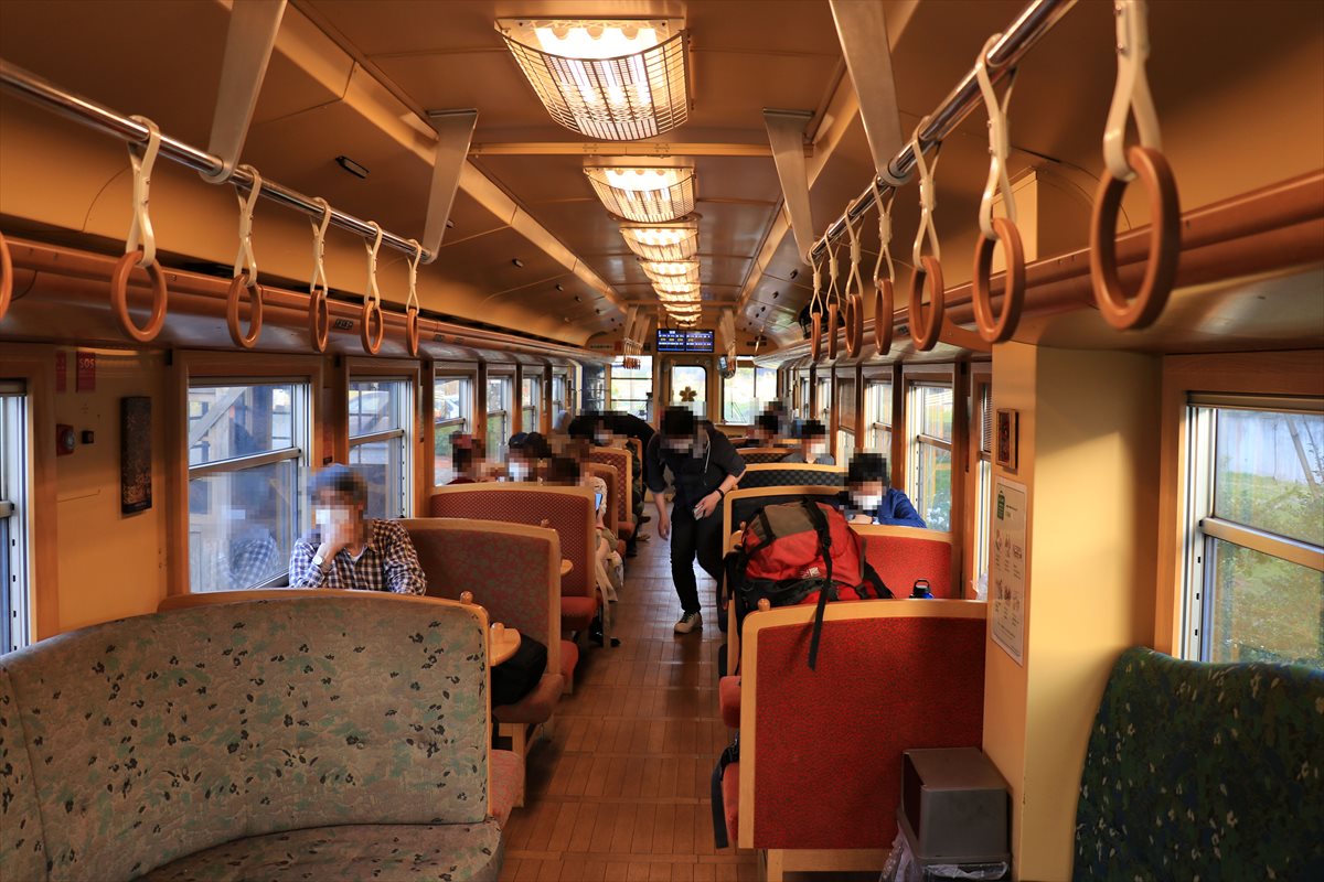 1両編成の車内はそれなりに混雑しています。鉄道マニア以外にも純粋な旅行者っぽい人の姿も多いですが……自分と同じ重伝建マニアも居るかな。